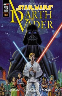 Come già scritto la qualità sia di testi sia di disegni è mediamente discreta, ma sono improvvisamente capitato sulla miniserie di Darko Macan e Dave Gibbons dedicata a Darth Vader. Si tratta in realtà della miniserie in 4 numeri Vader’s Quest pubblicata da Dark Horse nel 1999 e da Magic Press in Italia nel decimo volume della collana dedicata a Star Wars. Per quanto occorra dire che qui Gibbons non è al suo meglio (troppo si somigliano i volti dei ribelli), riesce comunque ad ergersi sopra a molti altri illustratori della serie anche nella realizzazione “tecnica” di caccia spaziali ed astronavi. Ma la vera maestria è quella di Macan (scrittore croato di cui non sapevo nulla e che scopro essere noto a livello internazionale solo proprio per le sceneggiature dei fumetti della saga ideata da George Lucas dopo i quali ritorna a lavorare esclusivamente su fumetti e libri noti esclusivamente a livello locale) che ci descrive in maniera estremamente efficace il momento in cui Darth Vader scopre il nome del pilota responsabile della Morte Nera, la sua ricerca e al contempo la ritrosia nello svelare tale scoperta all’Imperatore. Macan è un vero maestro nel farci immaginare le emozioni di Darth Vader -invisibili dietro la sua maschera oscura – al risuonare sulle labbra del ribelle torturato del nome di Luke, che sappiamo essere il suo stesso nome. Reagendo nell’unico modo possibile ad un signore oscuro dei Sith, Darth Vader ordina l’uccisione di tutti i possibili testimoni e si lancia alla ricerca del pilota, innescando una piccolo (e onestamente non particolarmente interessante) dramma su un pianeta fedele all’Impero.