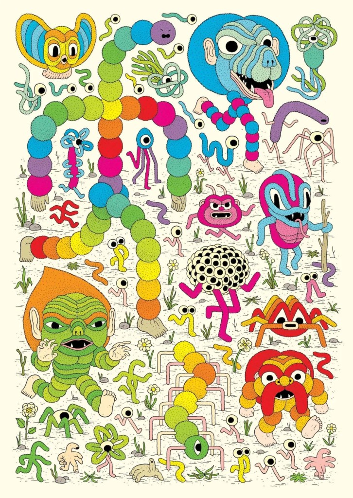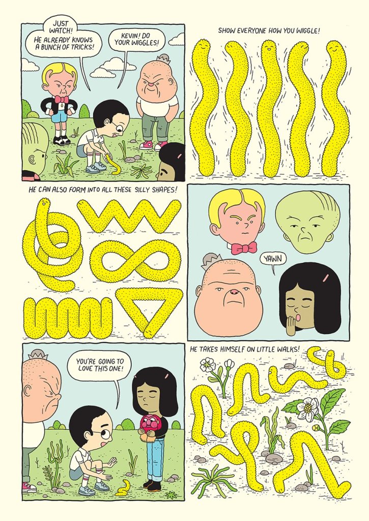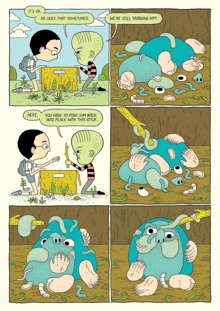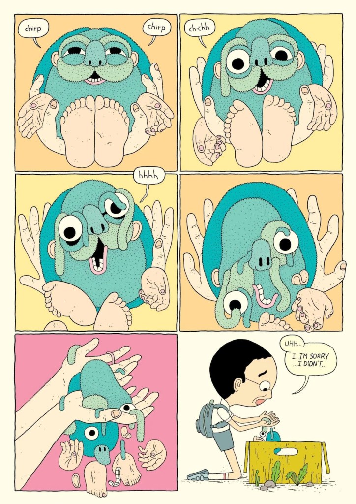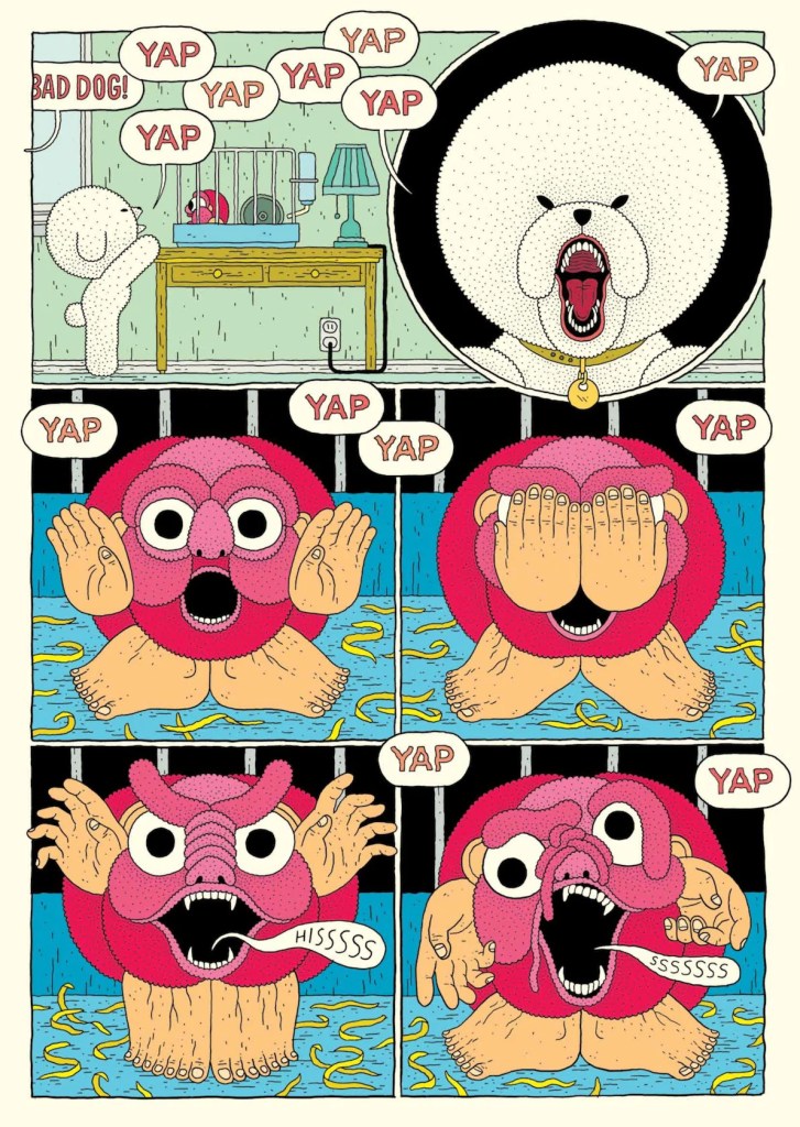 Ancora più peculiare New Pets: Jacobs apre il volume spiegandoci che – nonostante ci vediamo e vediamo quelli intorno a noi come organismi unitari, individuali, in realtà siamo tutti colonie di organismi, da quando gli organismi unicellulari si unirono per formarne altri più complessi, fino ad oggi in cui noi stessi siamo in realtà ospiti di organismi più semplici che ci consentono di sopravvivere. Che ha a che fare ciò con i nuovi animali da compagnia di cui ci parla il titolo? Semplice: la nuova moda, racconta nella sua storia, è quella di animali che in realtà sono costituiti da un gruppo di animali più semplici in gradi di dividersi, riunirsi, ricombinarsi. Il protagonista è un bambino timido e occhialuto, assillato da bulli, ma che nondimeno li segue perché hanno questi nuovi animali che tormentano per addestrarli e farli ricombinare in nuove forme. Alla fine però le forme che raggiungeranno saranno ben più grandi e minacciose di quelle previste e solo l’animaletto singolo che il nostro protagonista si è potuto permettere – allevato da lui con coccole ed affetto – riuscirà a scongiurare che gli animaletti riuniti in giganti, distruggano tutto. Ma non si torna all’happy end perché anche l’eccesso d’amore del nostro protagonista avrà effetti imprevisti. Rispetto ai fumetti precedenti New Pets ha due caratteristiche che lo contraddistinguono: una storia più “piccola” (non la costruzione di mondi o il trascorrere delle ere), non circolare o labirintica, e una grafica meno iper-affolata di dettagli, colorata e solare (nonostante la conclusione). In sostanza più fumetto e meno illustrazione, più storia e meno trip mentale. Concludendo: New Pets è meglio o peggio dei fumetti che lo precedono? A pelle direi peggio, perché il fascino fin da subito dei fumetti di Jacobs sul sottoscritto è dovuto proprio al loro essere trip mentali e grafici. Ma ciò non significa che questa ultima produzione non possa essere un punto di svolta per ulteriori forme di narrazione, altrettanto intriganti di quelle fin qui lette. E soprattutto non significa che, se meno visivamente geniale, non sia un fumetto – come gli altri di Jacobs – da leggere e da avere.