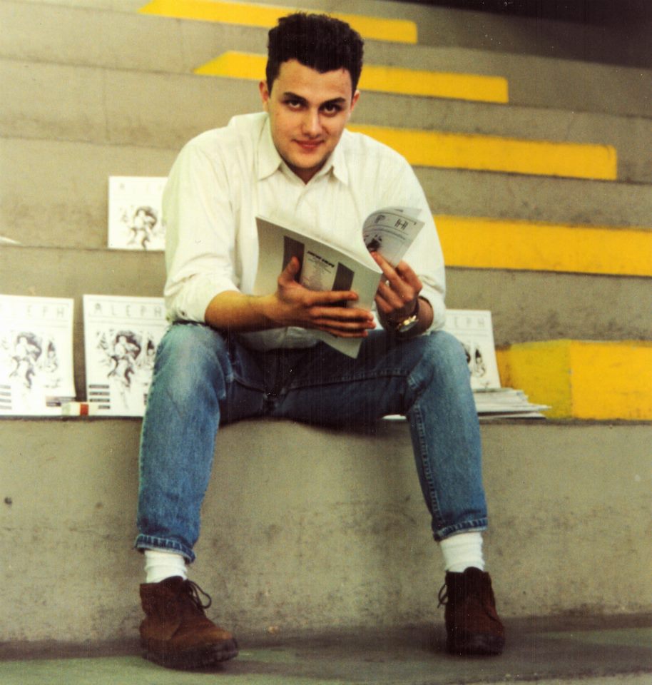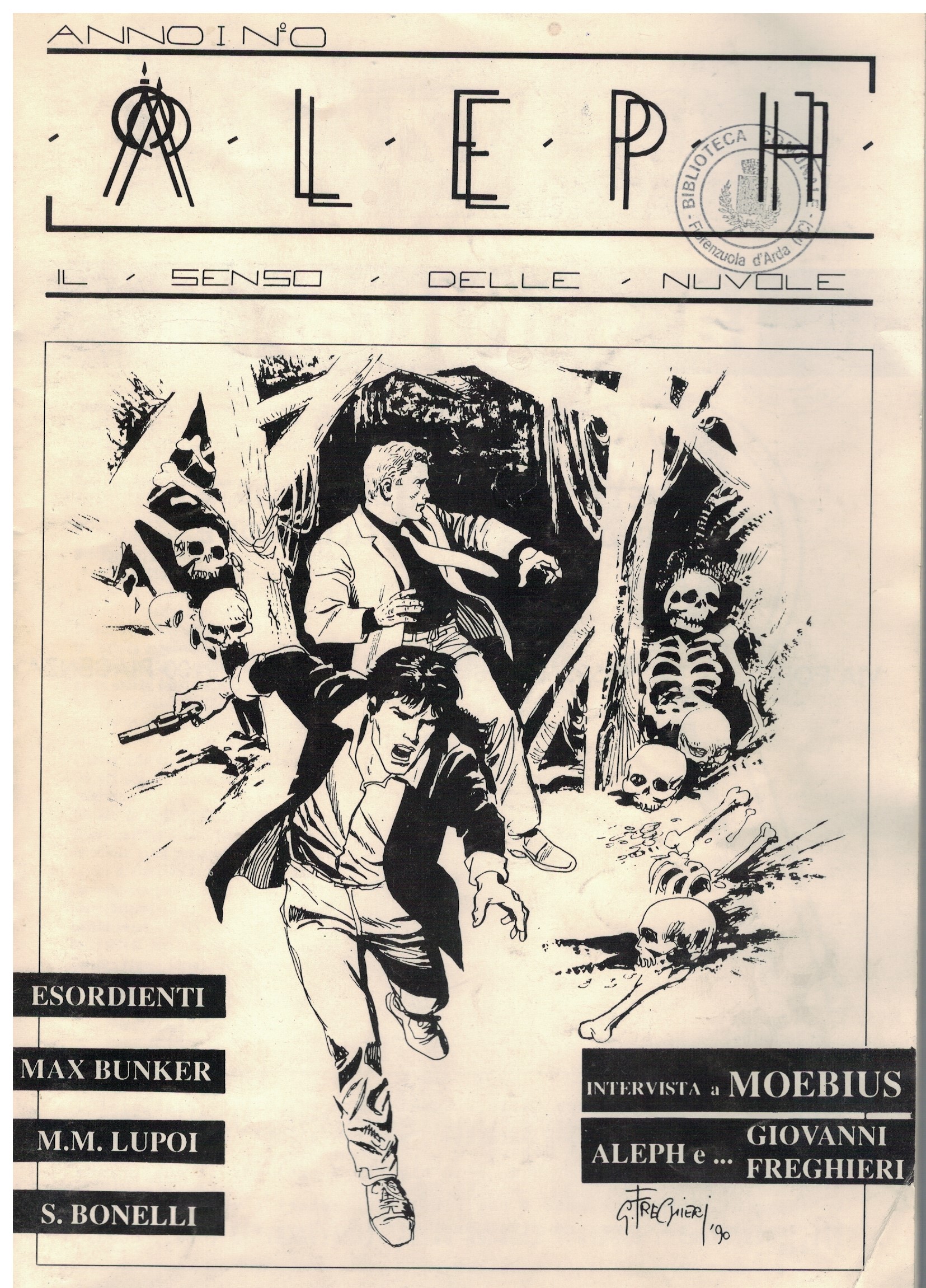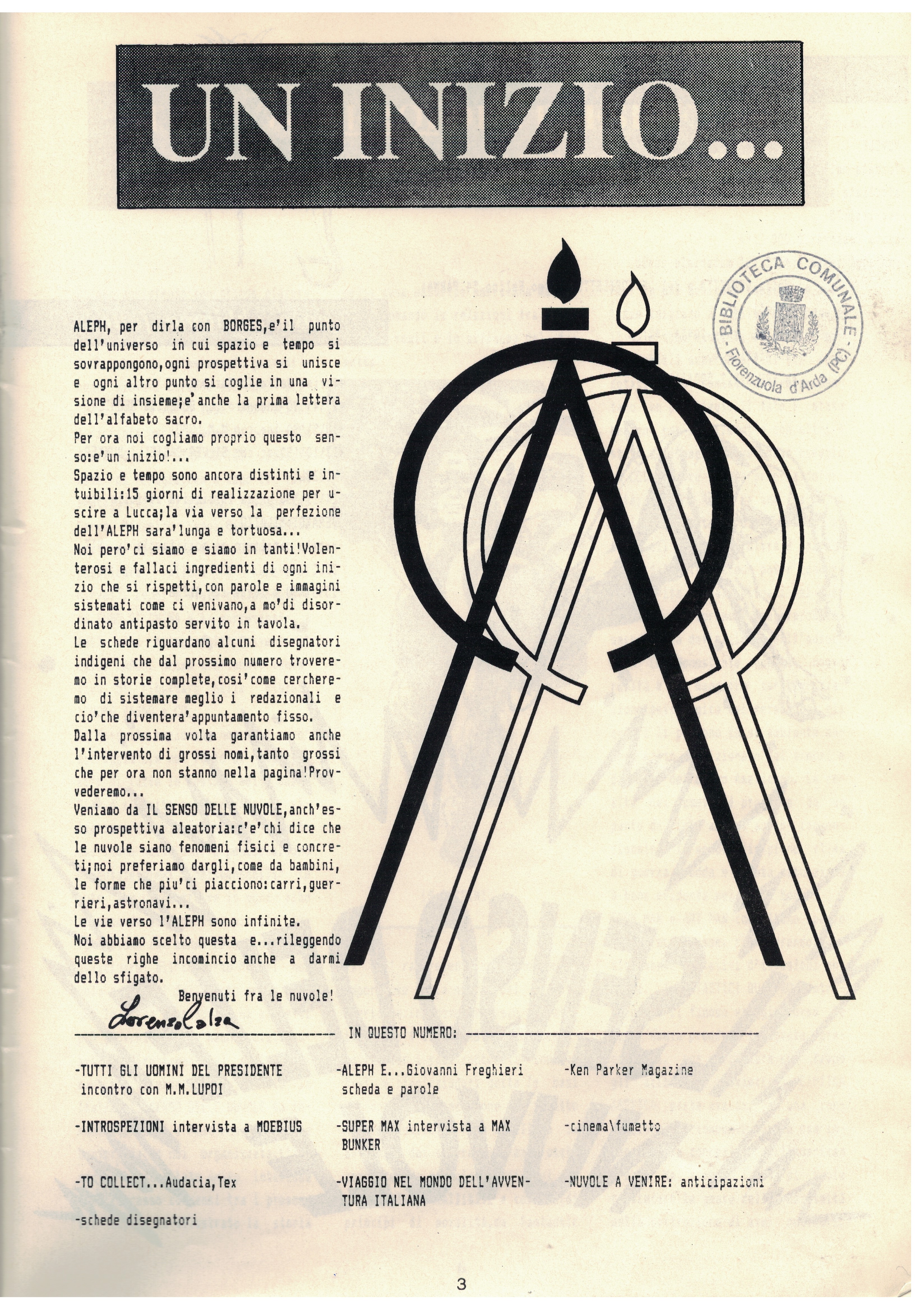Post scriptum: a seguire la copertina del n. 0 (1991?) di Aleph, la fanzine dell’associazione Il Senso delle Nuvole, e la pagina col primo editoriale di Lorenzo. Per finire la foto (scattata da me) di un Lorenzo giovane che cerca di spacciare copie di Aleph a Lucca Comics (non ancora & Games).