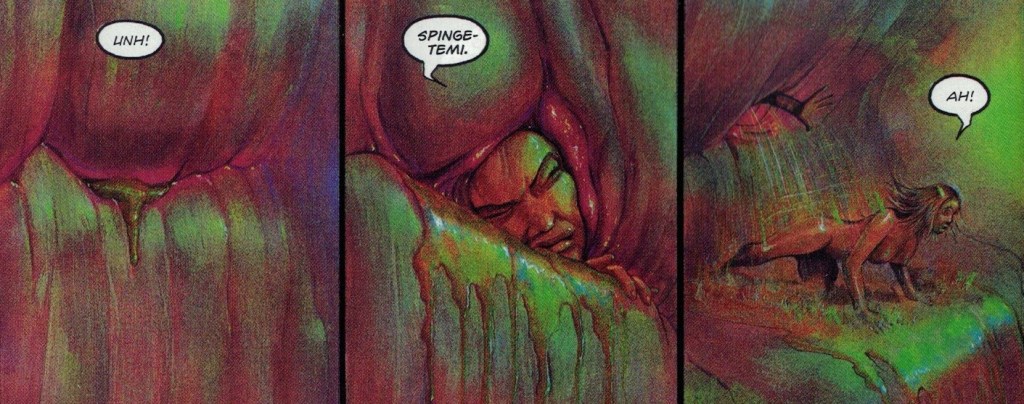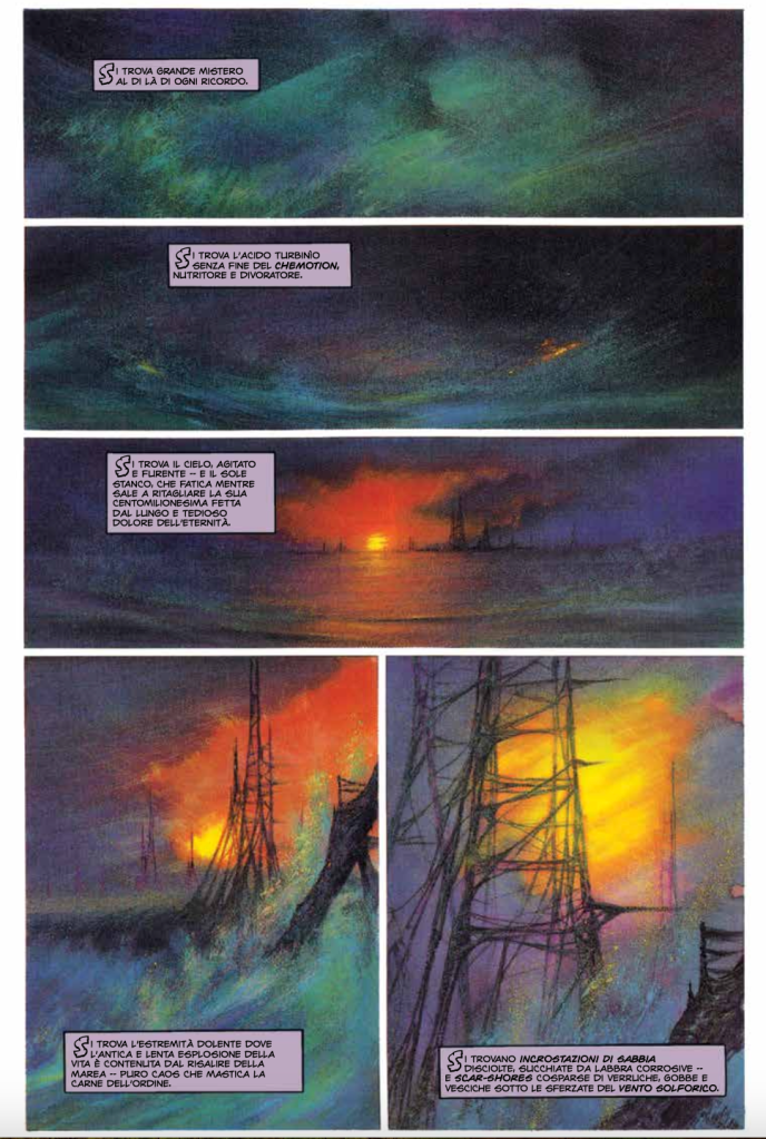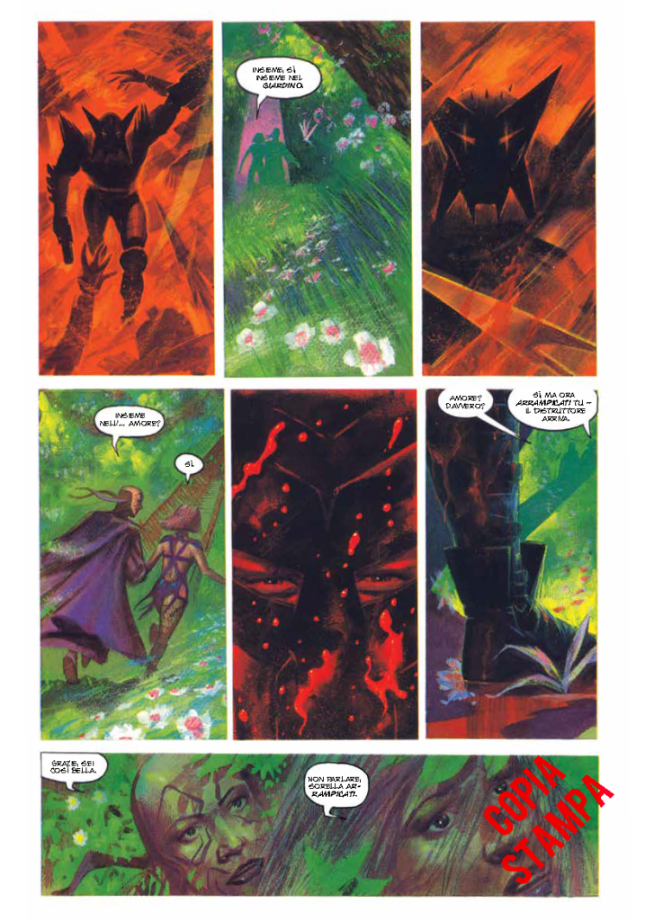 Dopo quattro anni di Hellblazer, ci è sembrata un’opportunità per lanciarci in un mondo di linguaggio oltraggioso e immagini sontuose… e nessuno ci ha trattenuto. Lo scenario della storia è fantastico e allegorico piuttosto che speculativamente futuristico. Immagino che i suoi temi siano più ampiamente filosofici di alcuni dei problemi socio/politici con cui mi sono confrontato attraverso le ambientazioni del futuro prossimo di opere come 2020 Visions, Hellblazer: Bad Blood e Narcopolis, ecc. [traduzione mia]