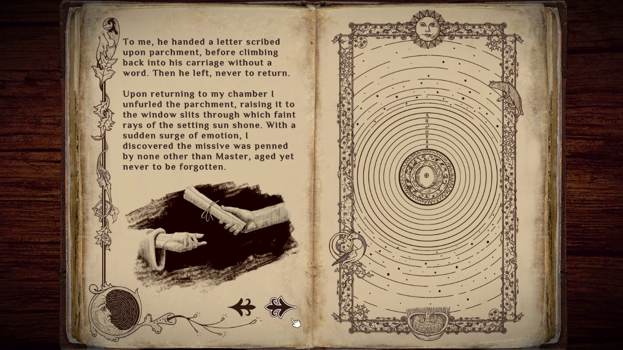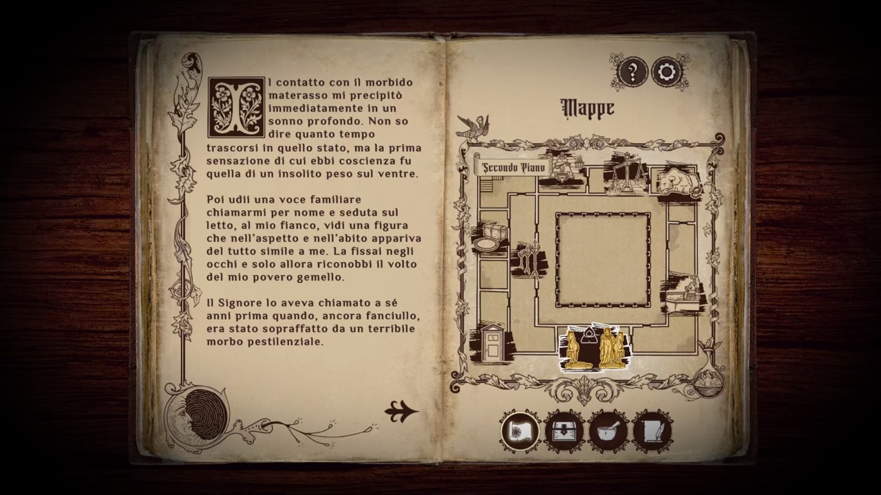 Di recente però su Steam e per Nintendo è uscita 49 Keys, la versione elettronica del librogame a cura dei suoi autori, coadiuvati da Veronica Wu e da 2P Games. Per provare a valutare adeguatamente la versione elettronica non potevo esimermi dal confrontarla con la versione cartacea e così ho letto e giocato entrambe. Inizio osservando come, se la versione cartacea pone il lettore in modalità lean forward, quella elettronica lo pone invece maggiormente in quella lean back perché a prendere gli appunti ci pensa per lo più il computer facendoci avanzare quando abbiamo correttamente risolti gli enigmi presenti. Beninteso l’esperienza nell’una come nell’altra versione è solamente quella della lettura: non ci sono nella versione elettronica animazioni ed esattamente come nel libro siamo chiamati a leggere la storia. Mentre però nel libro dobbiamo prendere nota di Oggetti, Ingredienti, Poteri occulti, Note e Parole chiave che raccoglieremo e apprenderemo, nella versione elettronica il computer lo farà per noi, per cui è apparentemente possibile stare rilassati con smartphone/tablet/portatile in mano o sulle ginocchia, o anche con una postura rilassata davanti al PC come se stessimo leggendo un qualsiasi best-seller. Certo: la questione tempo è ancora abbastanza rilevante perché l’interrompere la lettura in parti sensibili rischia di non farci raccapezzare una volta che la si riprenda (non posso quindi comunque portarmi la versione elettronica ad esempio in treno), ma sicuramente non ho la necessità di destreggiarmi col libro e la sua area annotazioni e il bell’opuscolo con le mappe, tavole e tabelle (oltre che alle stupende illustrazioni a colori). Tuttavia questa facilitazione rischia di diventare ingannevole quando, ad esempio come è capitato a me, riusciamo a concludere l’avventura senza avvederci che non abbiamo completato le evocazioni e quindi finiamo in un “bad ending”. Con la versione cartacea il rischio è minore proprio perché la necessità di prendere appunti in prima persona rende maggiormente evidente notare se si è tralasciato qualcosa. In compenso la versione elettronica comprende una suggestiva musica di sottofondo e le illustrazioni non raccolte in fondo ma inserite nel paragrafo appropriato.