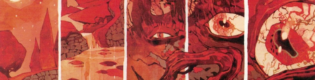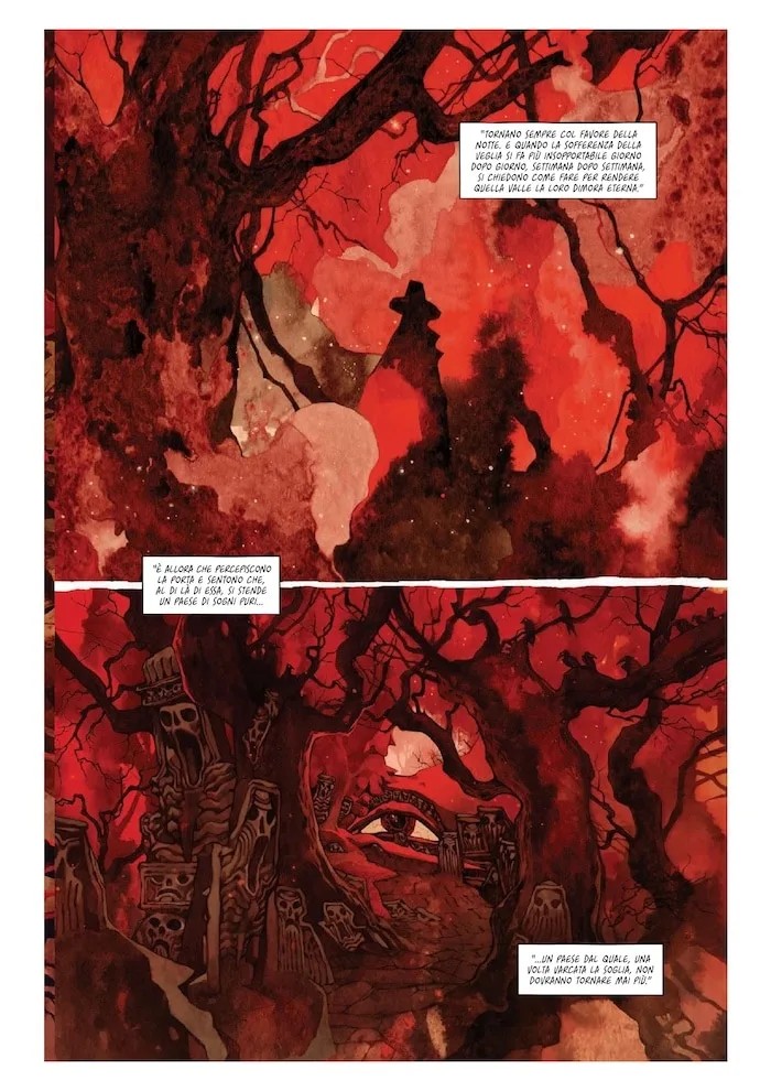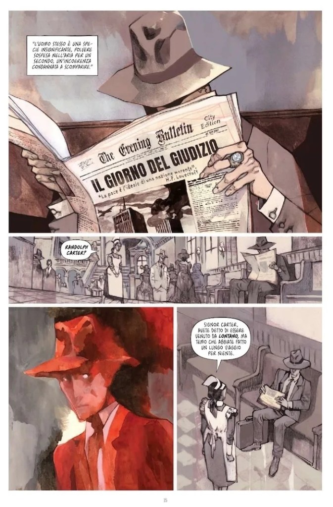 Lovecraft – quanto meno il Lovecraft di Giulivo e Rebelka – tutte queste possibilità le rifiuta sdegnosamente: ciò a cui anela è l’oblio, un oblio che riporti dopo la morte alla condizione che era precedente alla nascita. E non riescono a fargli cambiare idea neppure i grandiosi, luciferini e lisergici, panorami che si dispiegano davanti ai suoi occhi come se fossero usciti direttamente dai suoi racconti. Eppure questo destino sarà a Lovecraft negato: tanto era schivo e solitario in vita quanto la sua schiera di ammiratori si estenderà a livelli che per lui sarebbero stati sicuramente sgraditi. Anche grazie a scrittori: prima la schiera dei suoi amici – per lo più di penna – e poi a un terzetto che Lovecraft non riconosce ma che noi possiamo individuare, è sufficiente che siamo appena appassionati di fantastico, di horror, di fumetti. Scrittori che riprendono le sue tematiche, i suoi mostri totalmente alieni, il suo rappresentare l’essere umano come un granello infinitesimale in preda ad un universo di caos e li fanno diventare di culto. Lovecraft è oggi più vivo e in mezzo a noi di quanto lo sia mai stato nella sua breve vita. Dobbiamo allora dare retta a Gentile e constatare che Lovecraft non è mai morto. Ma quale Lovecraft? Nella riflessione di Giulivo e Rebelka infatti in qualche modo si sdoppia nel povero essere umano solo e desideroso d’oblio da una parte e nello scrittore-personaggio che s’atteggia a catalizzatore di una cerchia di scrittori.