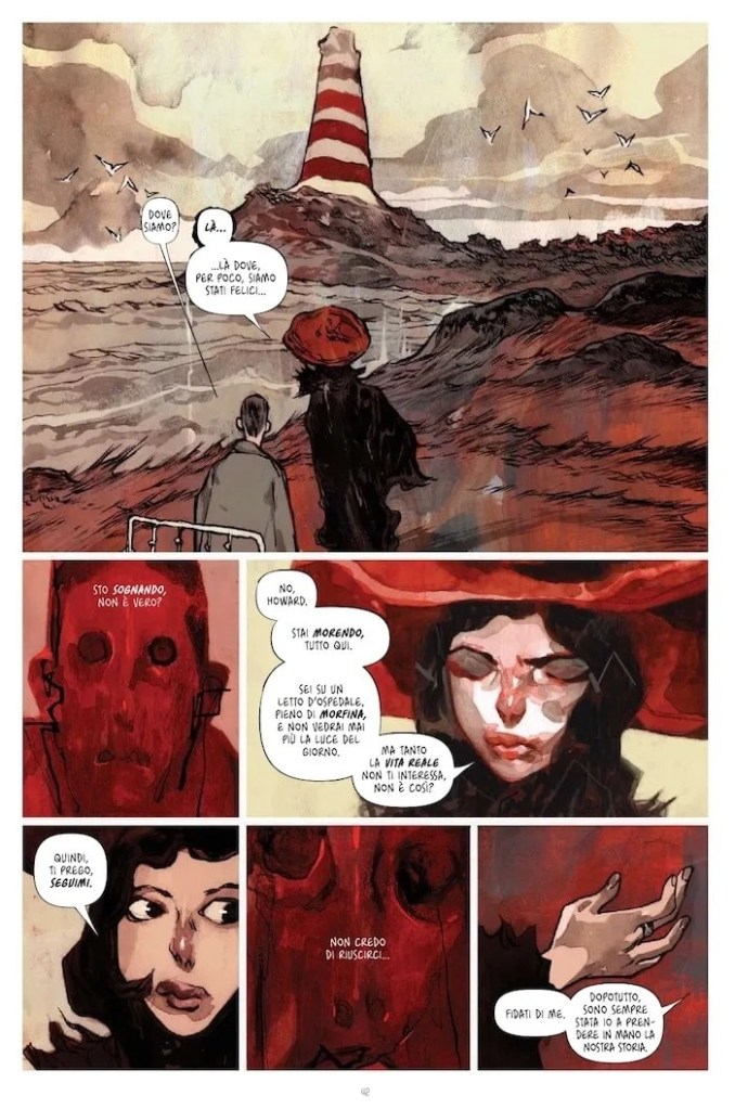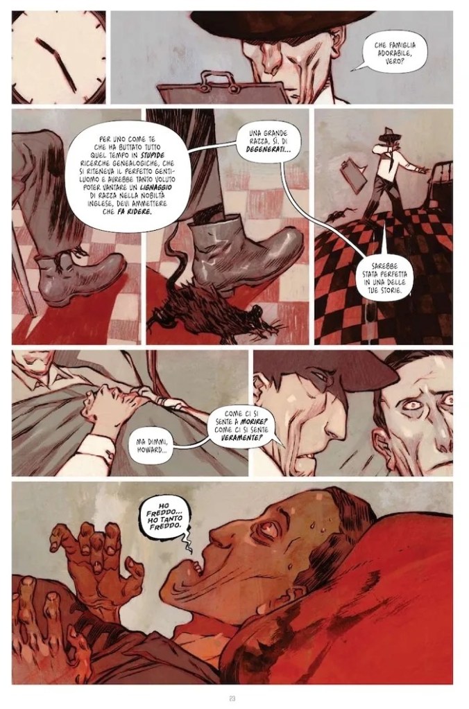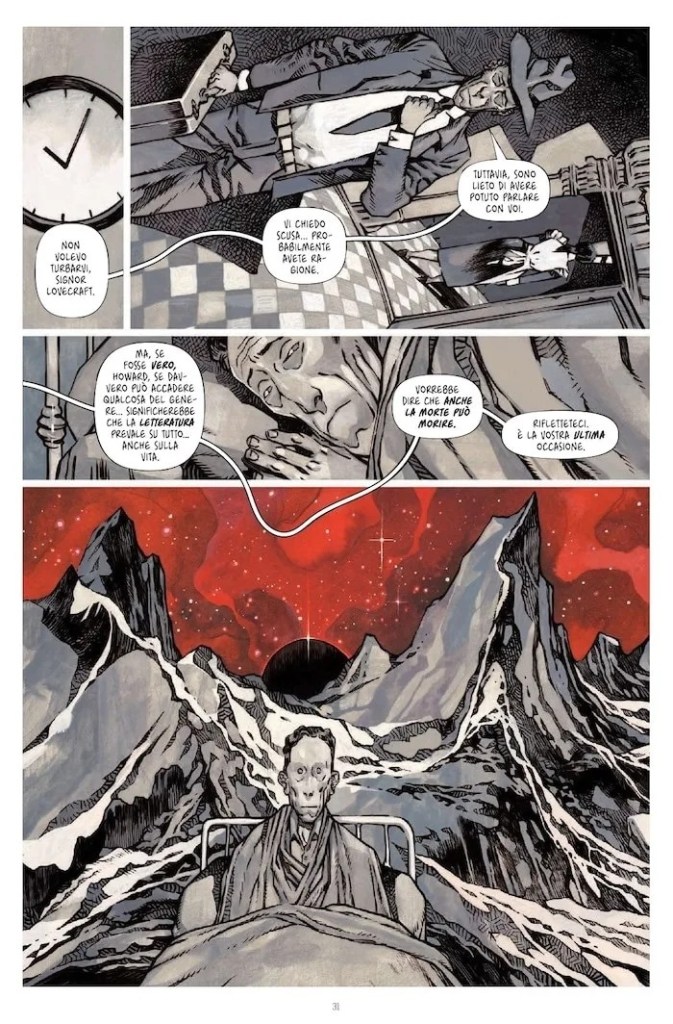 L’ultimo giorno di Howard Phillips Lovecraft è una imperdibile riflessione a fumetti sulla morte, attraverso l’immaginazione, la ri-creazione delle ultime ore di vita del famoso scrittore. I testi sono dello scrittore francese Romuald Giulivo e i disegni dell’artista polacco Jacub Rebelka. Da poco pubblicato in Italia grazie a SaldaPress, il libro immagina Lovecraft abbandonato in un letto d’ospedale, imbottito di morfina per sopportare il tumore allo stomaco in stadio terminale. Come Scrooge nella favola di Dickens, viene visitato da tre personaggi centrali nella sua vita ma che in realtà non sono davvero lì: il suo più utilizzato personaggio, la sua (ex-) moglie e il prestigiatore Houdini, per cui Lovecraft iniziò a scrivere. Tutti e tre vorrebbero convincere Lovecraft a negare la realtà e a scrivere per se stesso (e per i suoi lettori) una nuova storia che annulli il destino a cui si sta rapidamente avvicinando e lo consegni all’immortalità.