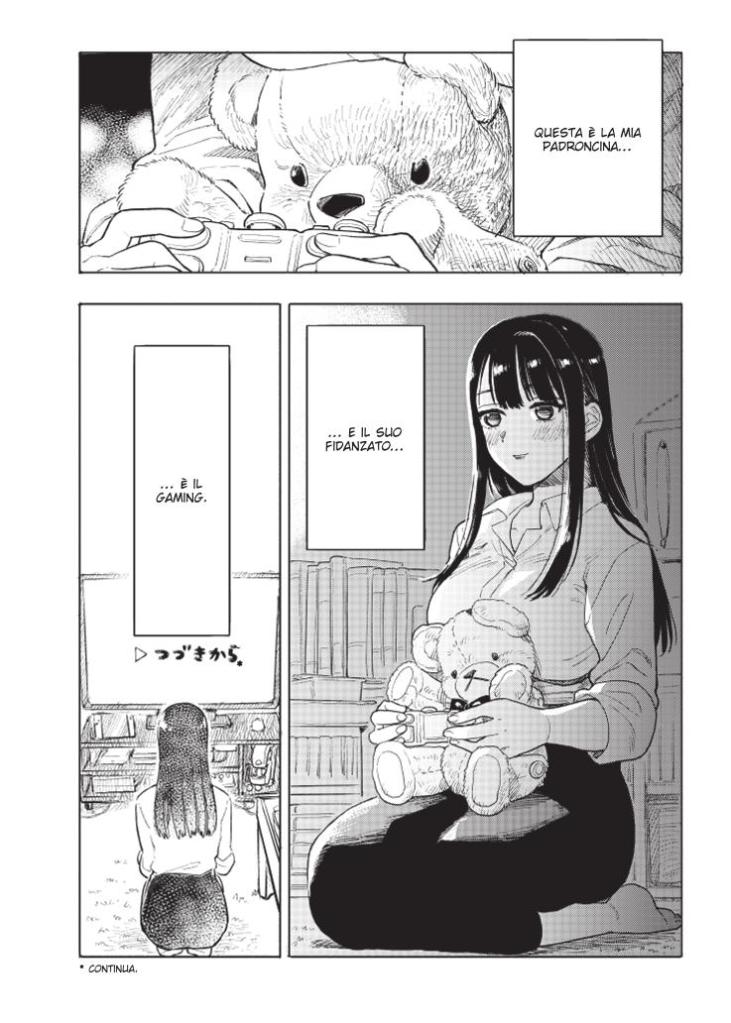 Discorso un po’ diverso per Videogame Girl: i disegni sono sempre all’insegna della carineria “giappo”, ma la storia risulta assai più interessante. Il narratore è l’orsacchiotto di peluche Kumazo che racconta le giornate della sua padrona, una giovane impiegata che divide le sue giornate tra ufficio e videogiochi tralasciando attività fisica, sonno, igiene alimentare e addirittura personale. Ovviamente già il fatto che il solo coinquilino della protagonista sia un orsacchiotto di peluche ci fa capire il livello della sua interazione con altre persone. La storia si struttura in brevi capitoli in cui osserviamo le varie fasi della discesa della giovane verso un comportamento da “hikikomori” con il rischio del completo estraniamento dalla vita sociale. Chi la salva è una giovane collega che, pur facendosi contagiare dalla passione per i videogiochi, li mantiene in una prospettiva “sana” ed equilibrata. Il mood della storia è “sospeso” esattamente come il carattere della protagonista che, se esplode emotivamente, è nella depressione per avere terminato un videogioco che la appassionava (e quindi dovere abbandonare il relativo mondo virtuale). La tematica e il fatto che sia sviluppata in una forma artistica di moda tra i giovani, ne fanno un’opera che potrebbe essere utilizzata a scuola per innescare, con ragazzi e ragazze, una discussione sulla “dieta mediale” ideale e su quella invece effettivamente osservata.