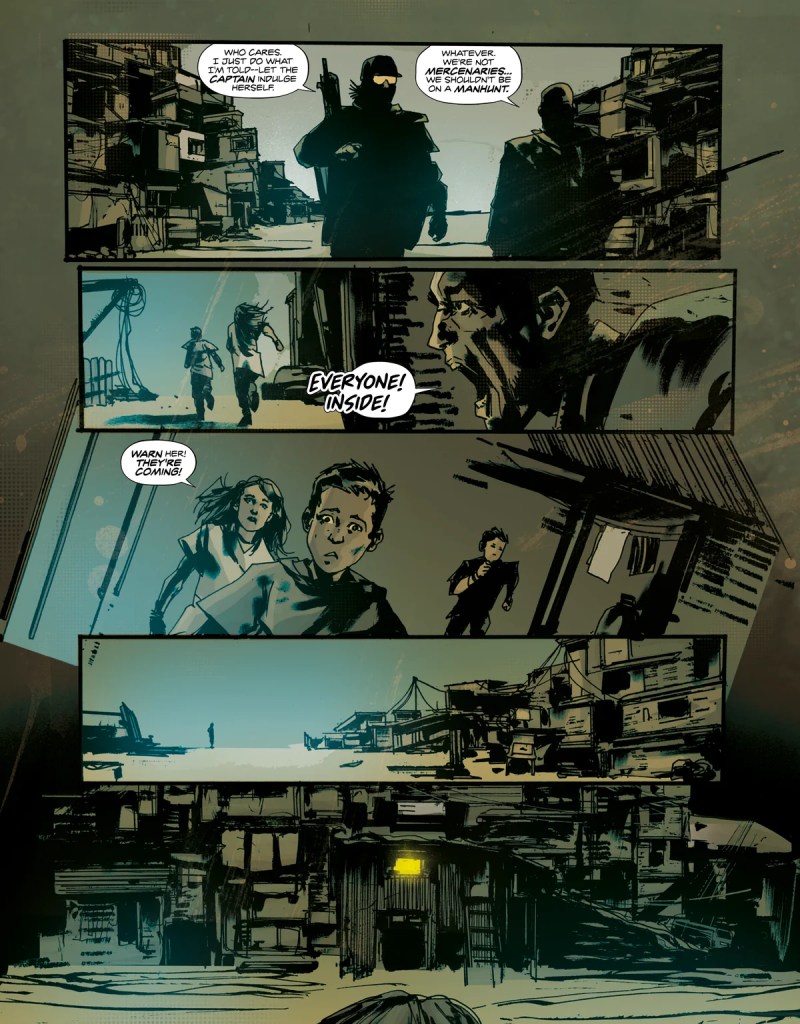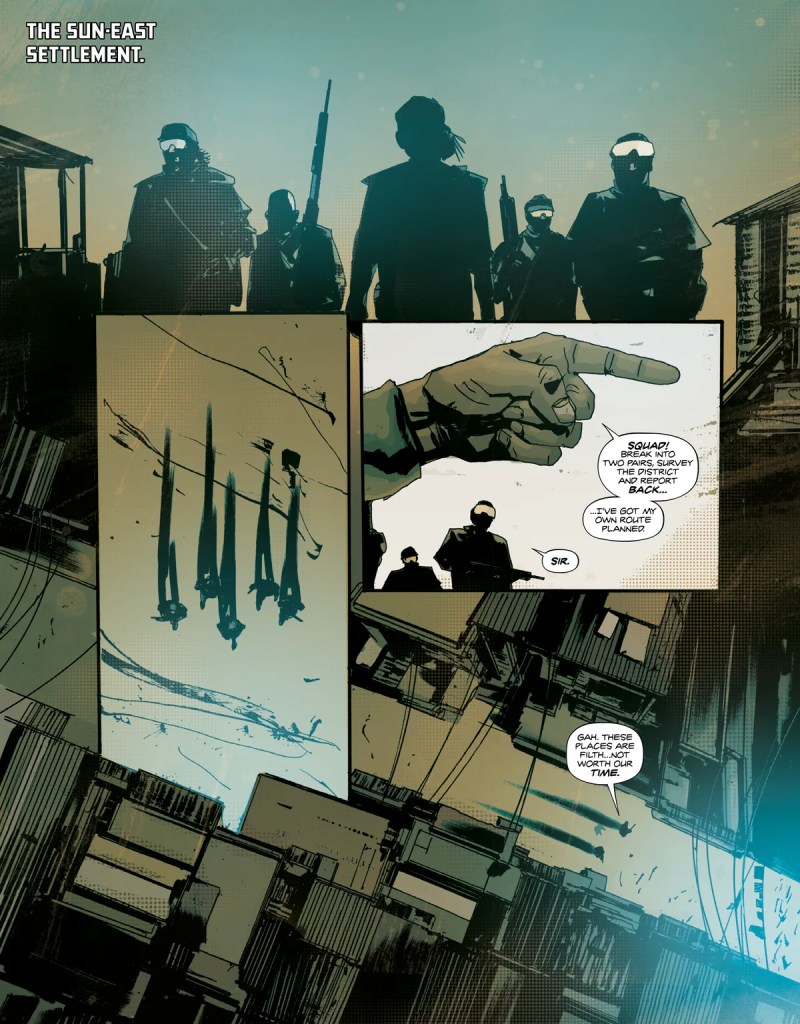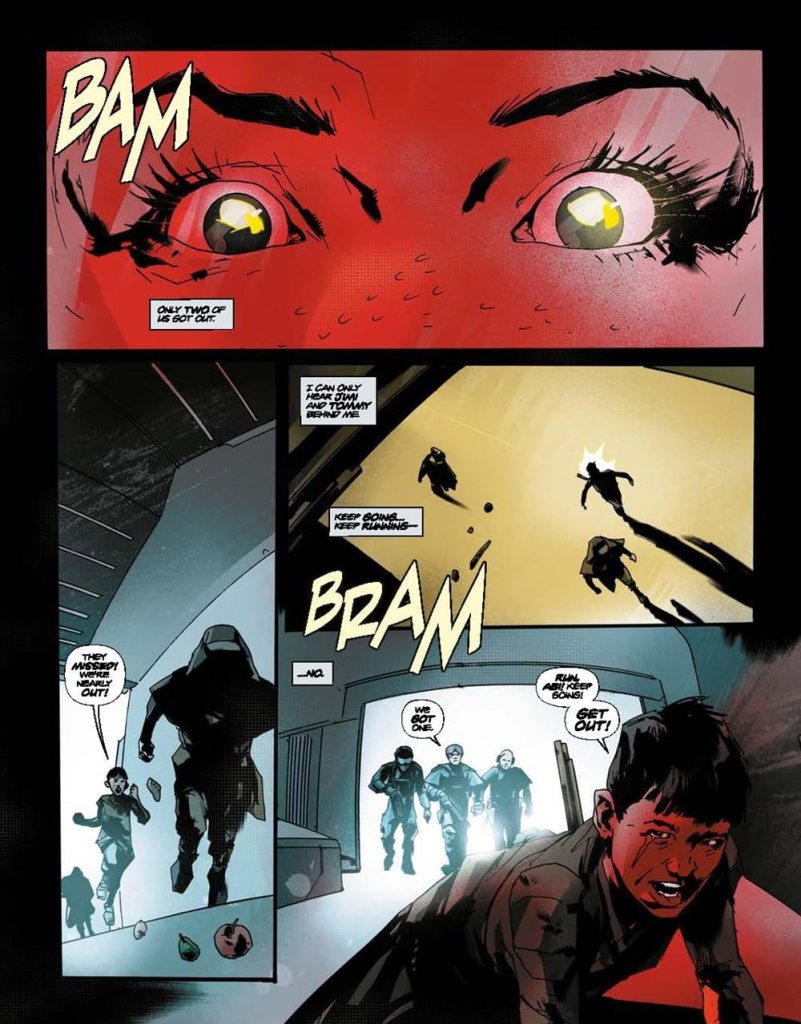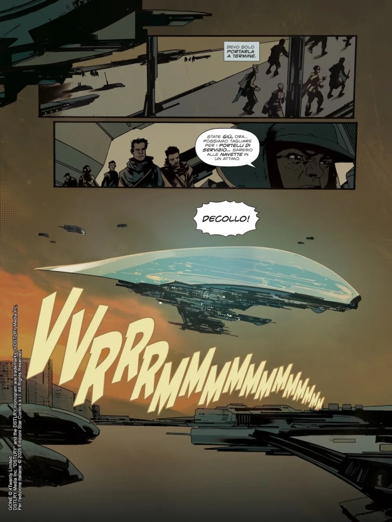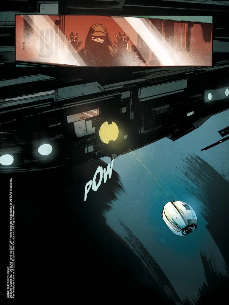 Da un punto di vista grafico Gone è un’opera stupenda: Jock utilizza abitualmente illustrazioni a tutta pagine e a volte anche a doppia pagina in cui, negli immensi meandri della nave, si muovono i personaggi. Gli stessi personaggi – e in particolare la protagonista Abi, ma anche i due comprimari maschi – il capo dei “sab” e il capitano della nave, non a caso agli antipodi eppure somiglianti – sono tratteggiati bene da un punto di vista psicologico nella nostalgia di casa da parte di Abi e nella bramosia di scalata sociale di entrambi gli altri due. Purtroppo non è possibile esprimere lo stesso entusiasmo per l’intreccio. Ed è un problema che era già presente anche in Batman: La notte del cavaliere oscuro: la storia è “tirata via” con buchi e elementi non adeguatamente spiegati e/o contestualizzati. Ad esempio quando Abi incontra il capitano da mostra di riconoscerlo, ma il lettore non ha idea del perché (mi sono pure riletto le pagine precedenti per il dubbio di essermi perso qualcosa). Ma anche senza esempi cosi specifici: chi sono i sabotatori e cosa vogliono? Cos’è l’entità e da dove arriva? Non si sa: occorre prendere per buone la loro presenza, le loro azioni, i loro effetti.