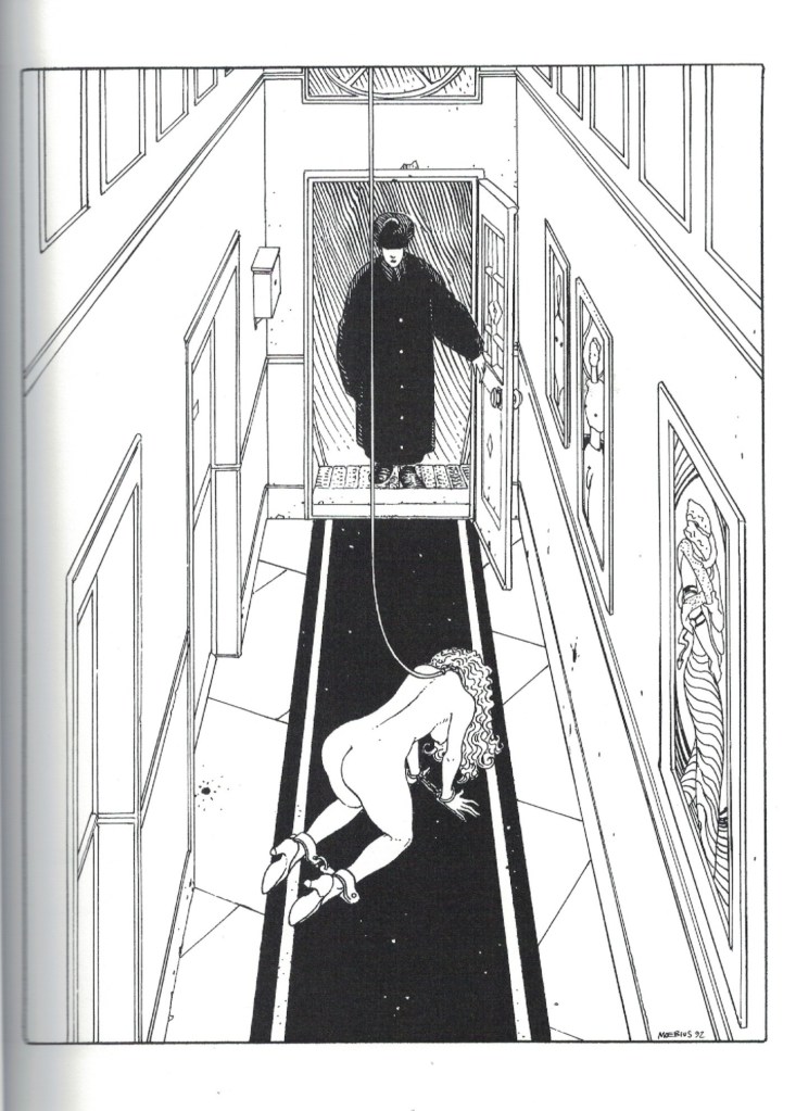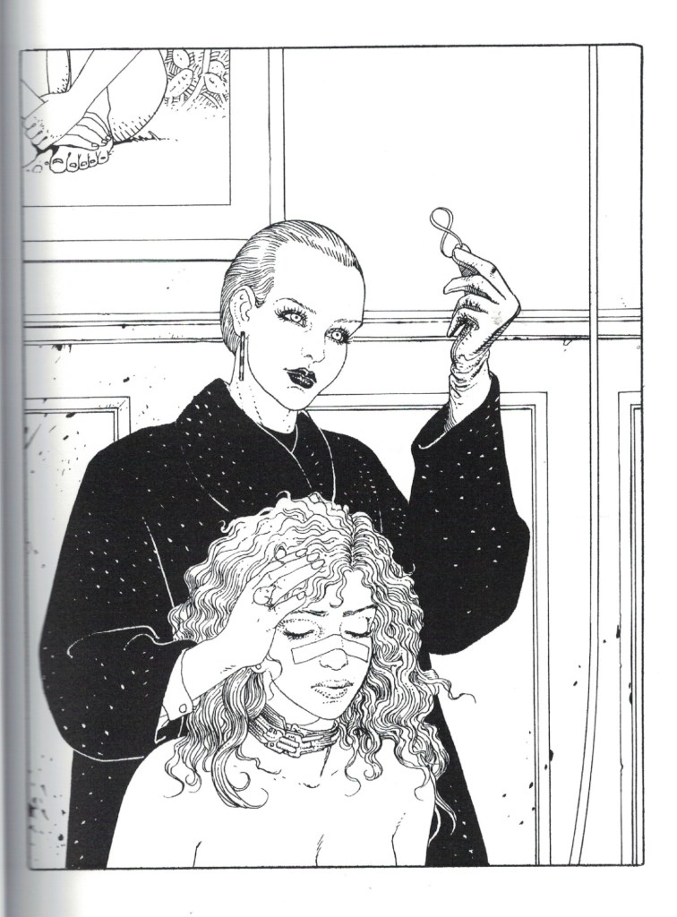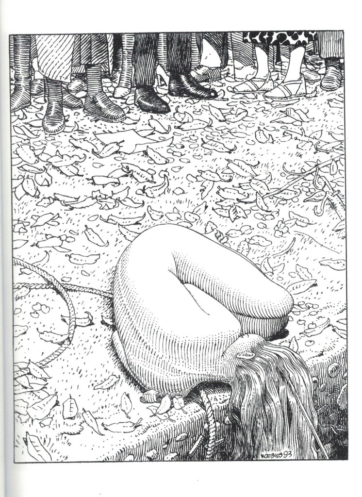 Artigli d’angelo, originariamente pubblicato nel 1994 (col titolo originale Griffes d’ange), ha almeno già una pubblicazione italiana nel 1998 da Castelvecchi, anche se sono abbastanza certo che la storia o almeno alcune sue tavole siano uscite anche su riviste a fumetti dedicate al fumetto erotico. Per di più non è possibile in realtà parlare di “fumetto” in quanto Artigli d’angelo è piuttosto una storia illustrata con sulla pagina di sinistra il testo di Alejandro Jodorowsky e su quella di destra la relativa illustrazione di Moebius (aka Jean Giraud). Tra l’altro alcune delle illustrazioni, oltre ad essere firmate, sono anche datate e le date presenti sono 92 e 93. Considerando inoltre che la donna (o le donne) rappresentate non sono sempre le stesse, mentre è una sola la “protagonista” della narrazione di Jodorowsky, è legittimo il sospetto che non siano i disegni ad illustrare la storia, ma piuttosto che sia stato Jodorowsky a costruire una narrazione attorno ad una scelta di disegni erotici di Moebius. Sicuramente la storia è in perfetto stile jodorowskiano: ermetica e onirica, psichedelica e misticheggiante. E si affianca perfettamente ai disegni moebiusiani: apparentemente fotografie prive di movimento ma che contemporaneamente comprimono in ogni immagine una quantità enorme di possibili narrazioni. Prendiamo ad esempio la prima (che riporto anche qui sotto) con una donna nuda raggomitolata su se stessa ai bordi di (un abisso? Un fossato? Un gradino?) e di fronte a lei ad osservarla una folla di uomini e donne, di cui scorgiamo solo le scarpe e i lembi inferiori degli abiti. In più il suolo è coperto di foglie ma c’è anche una corda, di cui un capo si perde nell’abisso sottostante. Quante storie possono essere immaginate a partire da questa immagine e da tutti i dettagli presenti! Così testo di Jodorosky e immagini di Moebius, piuttosto che illustrarsi a vicenda, formano un dialogo, in alcuni casi aspro e dissonante, tra narrazioni complementari. Le immagini di Moebius – c’è bisogno che lo dica? – sono semplicemente stupende, e il loro raffigurare una sessualità anche abbastanza indirizzata verso l’ostentata pornografia e il BDSM, le rende ancora più intriganti. In questo senso il colore sarebbe davvero di troppo a guastare il virginale bianco e nero che santifica sessi ed altri orifizi esibiti, sperma, urina e sangue, incontri e scontri di mucose.