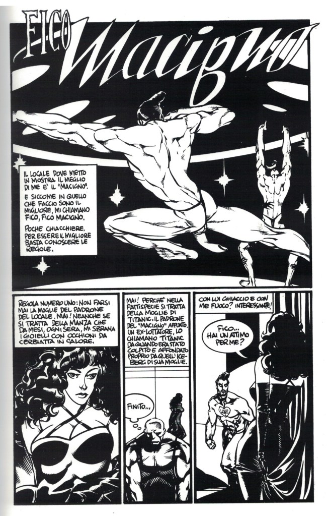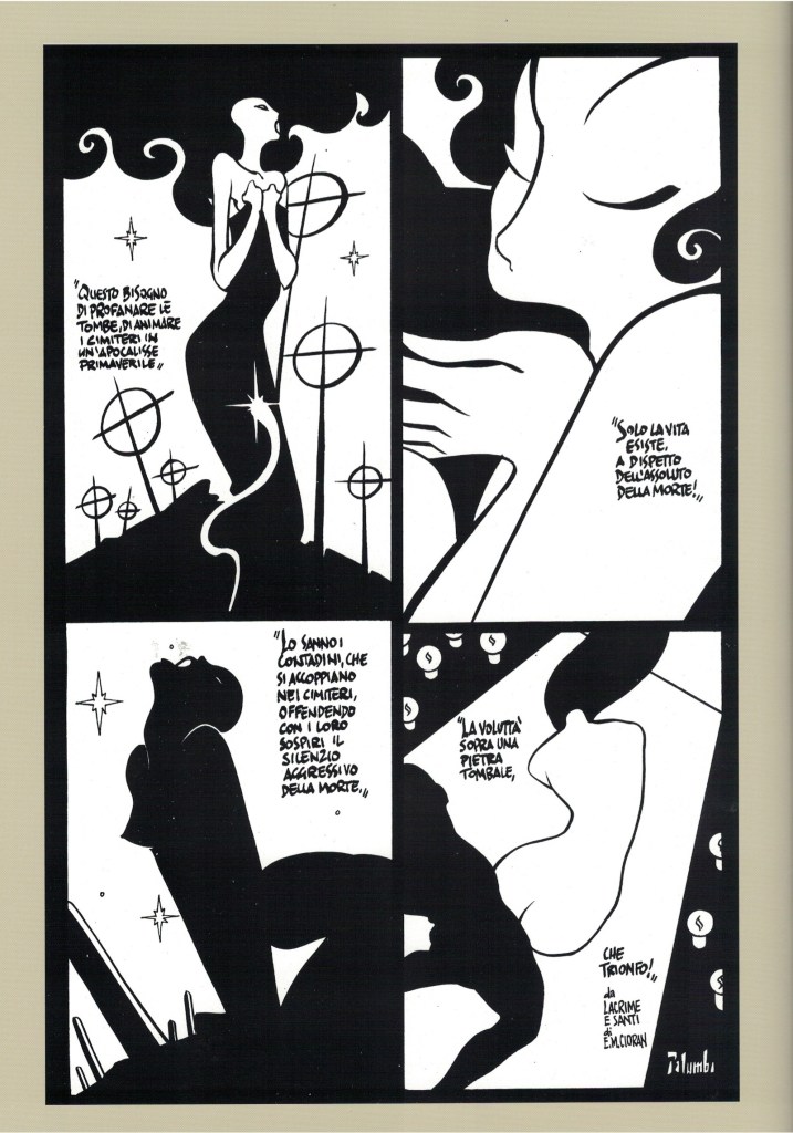 Ancora meno indicazioni sono presenti per il volume di Palumbo di cui si dice unicamente trattarsi di un archivio di “storie oscene”, “disegni erotici” e di “fantasie morbose” editi e inediti. In realtà Giuseppe Palumbo – oggi disegnatore regolare di Diabolik – inizia ad essere conosciuto nel mondo del fumetto nella seconda metà degli anni ‘80 grazie alle storie di Ramarro, il primo supereroe masochista. C’è già quindi alla radice del suo fare storie a fumetti l’osceno, l’erotico, il morboso. L’unica indicazione temporale che sono riuscito a ritrovare nelle tavole e nelle storie contenute nel volume (dato che Palumbo, a differenza di Moebius, non data nessuna sua tavola) sono due personaggi contenuti nella storia Fico Macigno. Incubo da maschiaccia armata pesantemente: Alma Parietti e Suor Imene Diretti, che ovviamente richiamano i due noti personaggi pubblici e il periodo del loro massimo splendore mediatico (fine ‘80-inizio ‘90). E non è comunque garantita una prossimità temporale tra tutte le tavole e le storie brevi presenti. Storie qui che possono a pieno titolo essere definite fumetti, con l’eccezione forse di Cunnus, sorta di manuale del cunnilingus su testi di Daniele Brolli, in cui l’“azione” si condensa in singoli disegni che illustrano il testo. Molto vario anche lo stile che va dall’undergrond vicino alle storie di Ramarro per Benta e per le due storie in cui è protagonista il macho Fico Macigno, agli acquerelli di Mangiare bere, ai colori caldi e accesi della taranta narrata in Nella canicola, ecc. Proprio le illustrazioni per Cunnus sono quelle che più si avvicinano stilisticamente al Moebius di Artigli d’angelo, dato che la bollente eroticità che dipingono viene fermata – ghiacciata – dal fermo immagine della loro natura. Ma nei “veri e propri” fumetti, e in special modo in Nella canicola, Palumbo dimostra di sapere usare con maestria anche gli strumenti grafici che danno a lettori e lettrici l’idea del movimento e del dinamismo. Non c’è, in LUST, l’esoterismo portato a Moebius da Jodorowsky, ma non necessariamente è un male. Le storie di Palumbo sono sì piccanti, ma anche divertenti, evidentemente non solo per lettori e lettrici ma anche per l’autore nello scriverle e disegnarle. Fedele inoltre al proposito d’avere natura “archivistica”, il volume presenta anche un inedito, Crateri, in cui ai testi di Maurizio Canosa corrispondono solo schizzi e abbozzi di vignette e tavole, ma anche un quaderno scansionato con un alfabeto di atti sessuali, così come tavole singole sparse qua e là tra le storie.