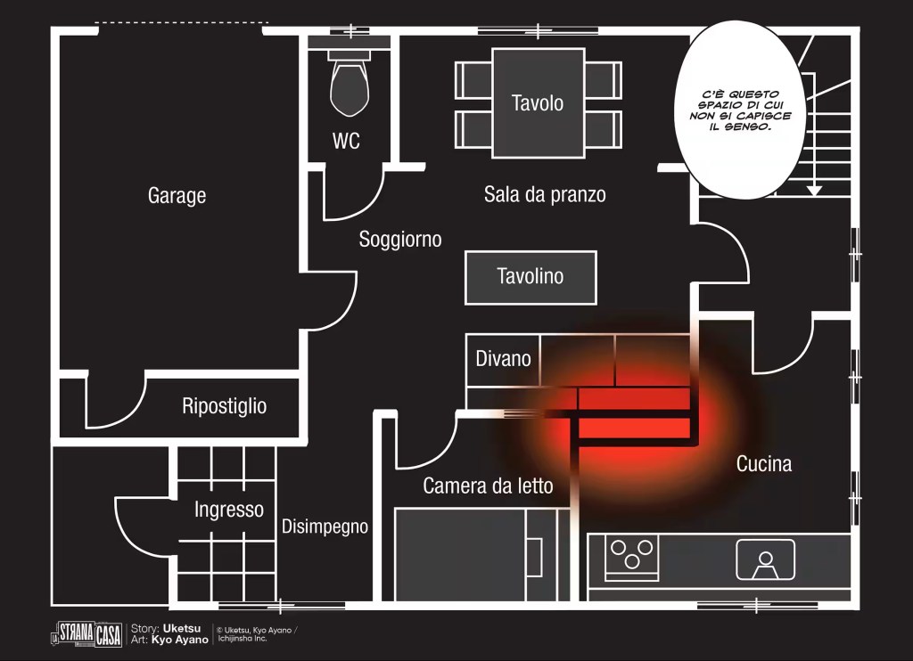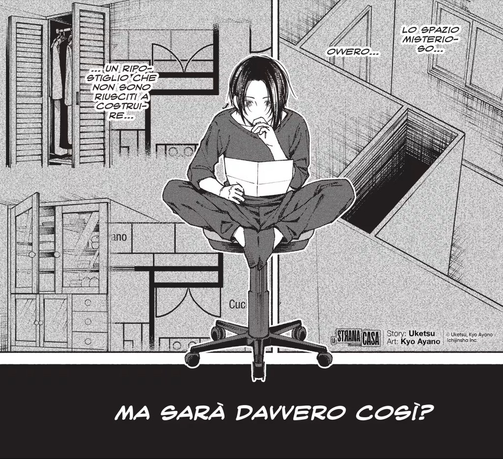 Occorre dunque partire da La strana casa, il primo romanzo di Uketsu, pubblicato in Giappone nel 2021. Purtroppo il romanzo, così come il film The Floor Plan che ne è stato tratto nel 2024, non sono disponibili in italiano. Ho tuttavia recuperato alcune recensioni di quest’ultimo che lo giudicano avere un buon inizio ma poi sviluppare male la tensione per perdersi su una strada decisamente meno affascinante nella conclusione. Però potrebbe essere un difetto di un cattivo adattamento piuttosto che derivante dall’opera originale. De La strana casa in Italia abbiamo al momento a disposizione solo i primi tre volumi del manga, poco più della metà dell’opera comunque al momento incompleta. La storia ci presenta un giovane giornalista freelance specializzato di occulto che si ritrova interpellato a proposito della planimetria di una villetta con spazi interni che paiono non avere alcun accesso e stanze interne senza alcuna finestra. Il giornalista (disegnato da Kyo Ayano con tratti ambigui tra il maschile e il femminile) coinvolge un amico architetto e insieme ipotizzano che spazio e camera fossero utilizzati per compiere delitti. Una indagine sulla residenza precedente della famiglia che aveva fatto costruire la villetta li porta alla conferma di elementi strani e misteriosi. Nella storia capita infine anche la sorella della donna che viveva nelle due case che racconta come quest’ultima sia sparita dalla sua famiglia d’origine per ricomparire solo anni dopo, sposata a con un bambino piccolo, ma senza spiegare le motivazioni del distacco e poi sparendo di nuovo con tutta la sua nuova famiglia. Nel terzo (e finora ultimo in Italia) volume il giornalista e la sorella esplorano la casa dei nonni della seconda dove è avvenuto un mortale e misterioso incidente ai danni di un cugino quando le due donne erano bambine. Anche qui, una tradizionale casa giapponese, vi sono spazi e stanze misteriose di cui al lettore al momento è ancora ignota la funzione e l’utilizzo.
