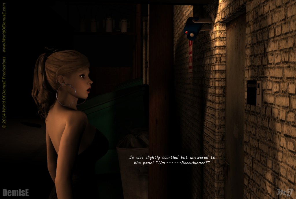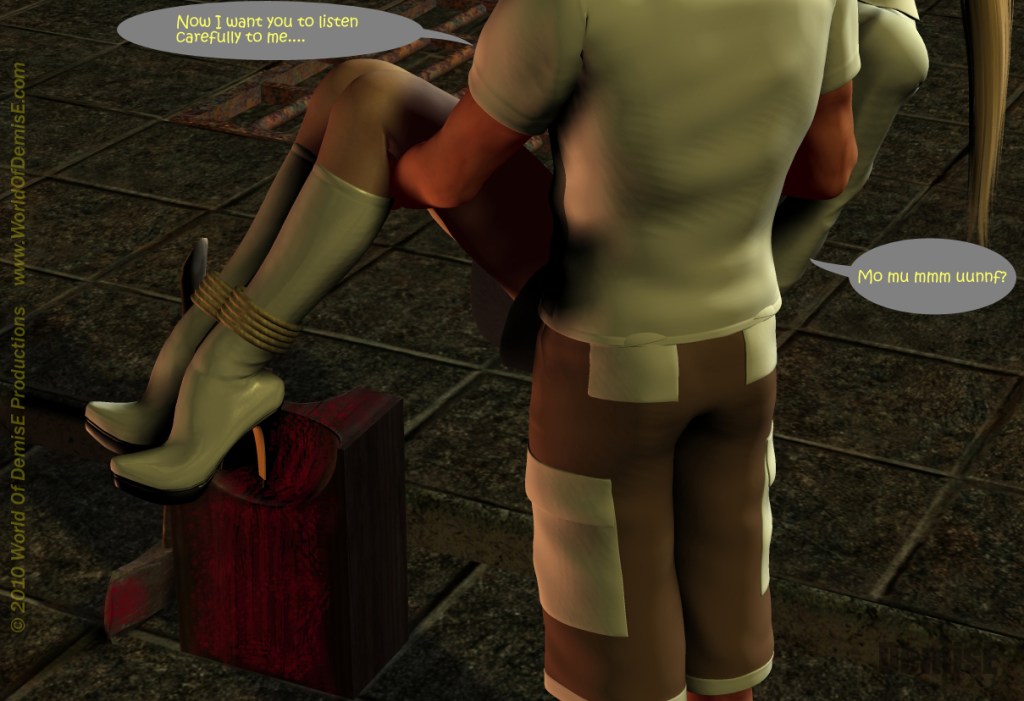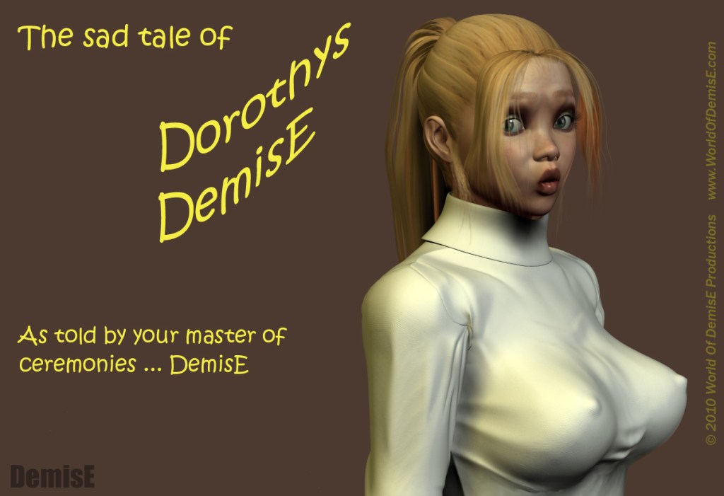 Le perversioni di Demise restano quelle di Dolcett, al limite si aggiungono modalità di morte delle sue modelle virtuali – l’annegamento nelle sabbie mobili e l’essere divorate da piante carnivore – e, in compenso, c’è un’attenzione e una morbosità molto minore nel rappresentare le sue modelle nell’essere cucinate e mangiate. La premessa delle storie è sempre la stessa: sull’Isola di Demise c’è una lotteria a cui partecipano tutte le donne presenti sull’Isola. Quando una donna viene estratta, viene uccisa (mediante soffocamento, decapitazione o impalamento) e poi arrostita. Ma a Demise interessa fino all’atto dell’uccisione e il resto lo lascia all’immaginazione dei suoi lettori. È anche vero che è necessaria un’avvertenza: ho seguito i lavori di Demise fino all’inaugurazione delle Island Adventures, che attualmente sono composte da 16 capitoli, ma già dopo i primi ho abbandonato per noia. Mi soffermerò dunque solo su alcune delle storie contenute nella sezione “Legacy Projects” del suo sito World of Demise. Sul sito si trovano tutti i suoi progetti che possono essere liberamente scaricati. I file però sono compressi e protetti da password e, per poterli visualizzare, è necessario iscriversi su Patreon e diventare un membro della sua pagina versando 80 dollari di Hong Kong al mese (circa € 8,76). Diventando membro è possibile scaricare dalla pagina su Patreon le password per scomprimere i file e poi sospendere il sostegno, almeno fino a quando Demise pubblicherà nuove storie (precedentemente Demise aveva un account su Fanbox – che è stato bannato – su cui metteva le password a rotazione proprio per evitare che gli utenti pagassero un solo mese di iscrizione, mentre per il momento l’iscrizione su Patreon da l’accesso a tutte le password).