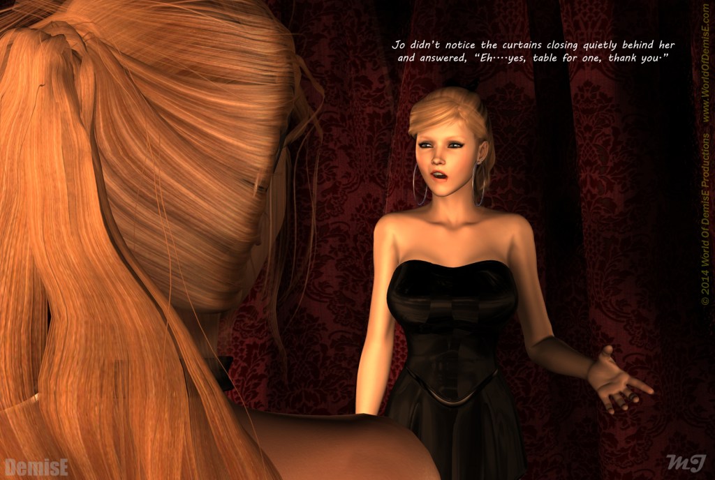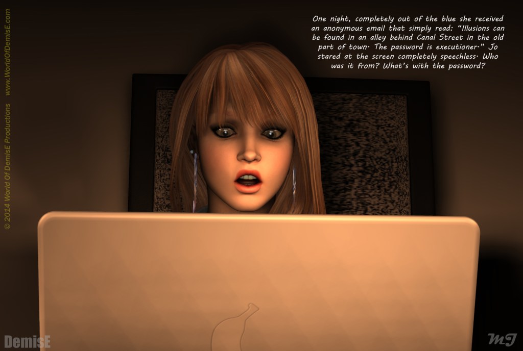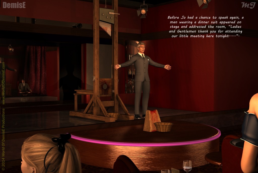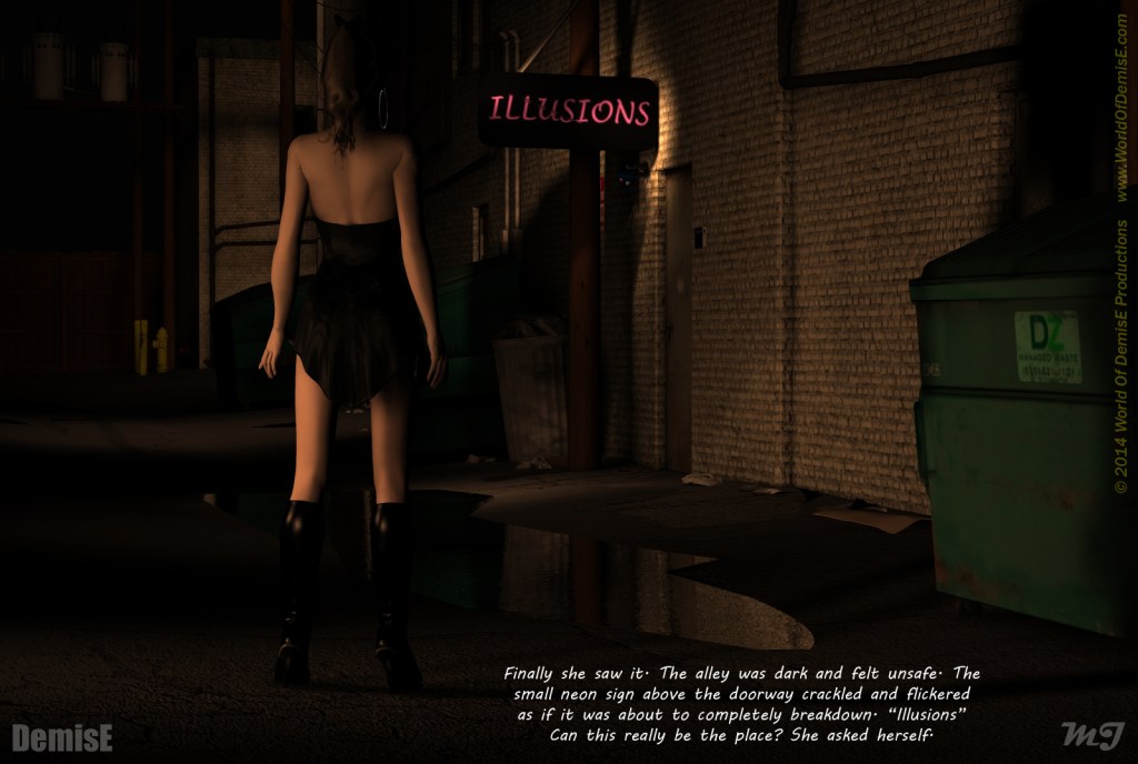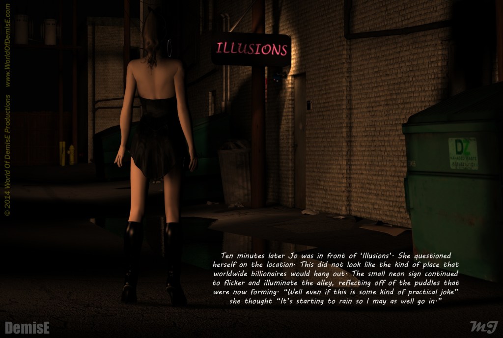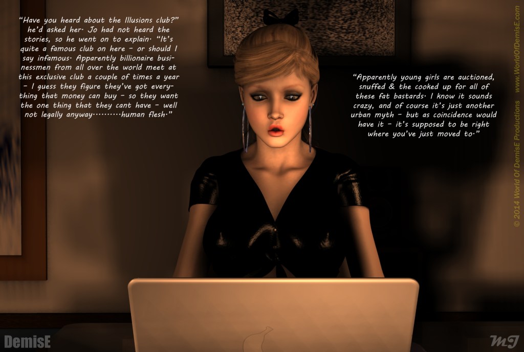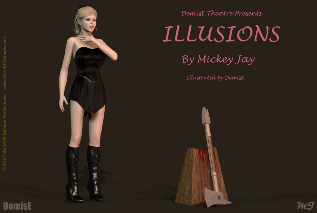 Illusions è un’opera diversa dalle altre, ma probabilmente è dovuto al fatto che qui la storia è accreditata a Mickey Jay piuttosto che al solo Demise, che invece si occupa della sceneggiatura e della parte grafica. Illusions racconta di Jo che si trasferisce in una nuova città e, navigando su Internet, si imbatte nella storia dell’“Illusions club” dove, un paio di volte l’anno si riunirebbero da tutto il mondo dei super ricchi per mangiare carne umana di donne appena uccise. Tutto fa pensare ad una leggenda urbana ma, in seguito al suo assiduo domandare a chiunque, riceve una mail che la invita ad una delle serate dell’Illusion club. Dopo una serata passata con le amiche decide di accettare l’invito e recarsi al club situato in una zona apparentemente degradata. All’ingresso Jo si ritrova però circondata da cameriere e velluti rossi. Si siede e ordina champagne mentre si svolge una puntata su una giovane donna nuda. Vince un magnate francese per cui la ragazza viene decapitata e cucinata. Jo reputa il tutto un effetto speciale, un’illusione, come da nome stesso del locale. Ma mentre la ragazza viene decapitata il presentatore annuncia che sarà proprio lei la seconda “ospite” della serata. Dopo che il corpo della prima ragazza viene portato via si svolge il secondo giro di puntate per decidere chi si mangerà Jo. Lentamente si rende conto che non si tratta di un gioco di ruolo, ma la cosa, invece di terrorizzarla, la eccita. Tanto più che il giro di puntate per aggiudicarsela è vinto da un affascinante californiano che, prima di farla decapitare, le concede un rapporto sessuale. Jo è l’unica donna delle opere di Dolcett che, prima di essere decapitata (o impalata, o impiccata), sorride eccitata nell’attesa che si compia il suo fato.