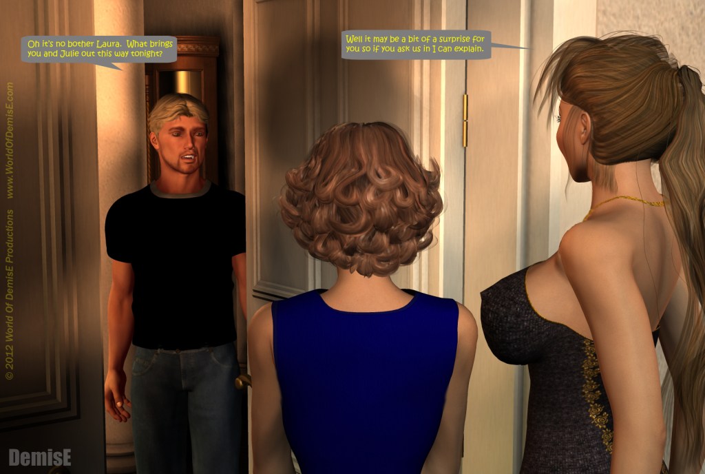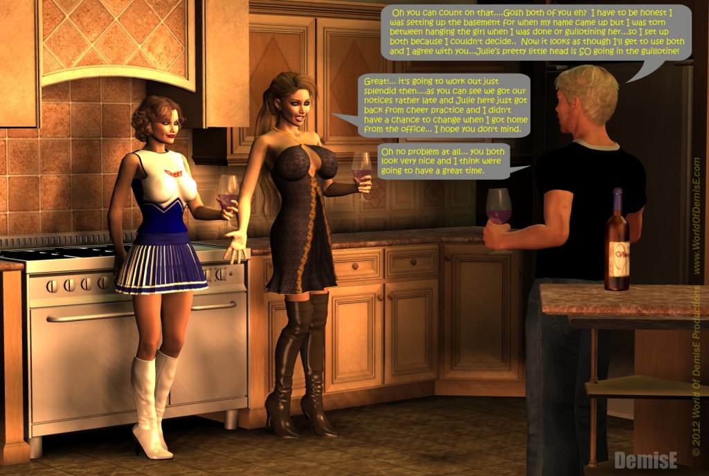 In Laura and Julie’s Last Night Out assistiamo all’arrivo di Laura (la madre) e Julie (la figlia) a casa di Bill una sera. Le due gli riferiscono di essere state selezionate dalla lotteria e, potendolo, preferirebbero essere uccise da lui dopo una notte di sesso a tre. Dato che si tratta di due donne assai avvenenti (è Demise che le “disegna” così…) a Bill la cosa non pare vera e accetta senza tergiversare. Tutti e tre si ritrovano quindi nel seminterrato dove Bill conserva gli attrezzi del mestiere: una forca e una ghigliottina, ma prima del lavoro il piacere e i tre passano una notte bollente fino a quando arriva l’ora delle esecuzioni. Anche qui Demise non risparmia i tocchi di comicità con Bill che lascia alla figlia l’impiccagione della sempre più sgomenta Laura, con la figlia che suggerisce a Bill attività sessuali con l’agonizzante madre prima di dover anche lei infilare la testa nella ghigliottina ed iniziare a disperarsi a sua volta.