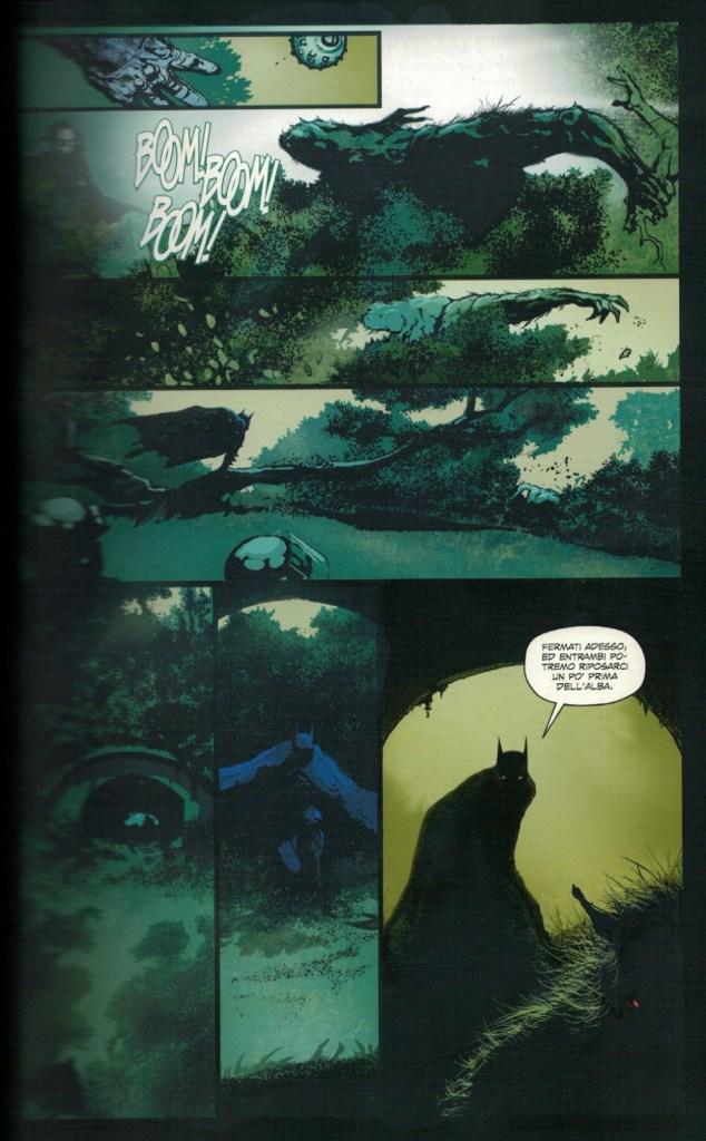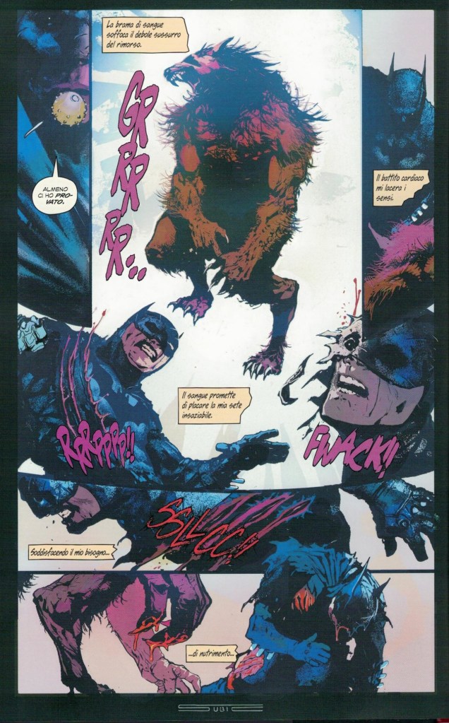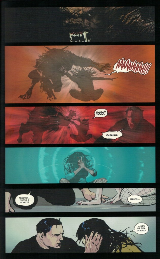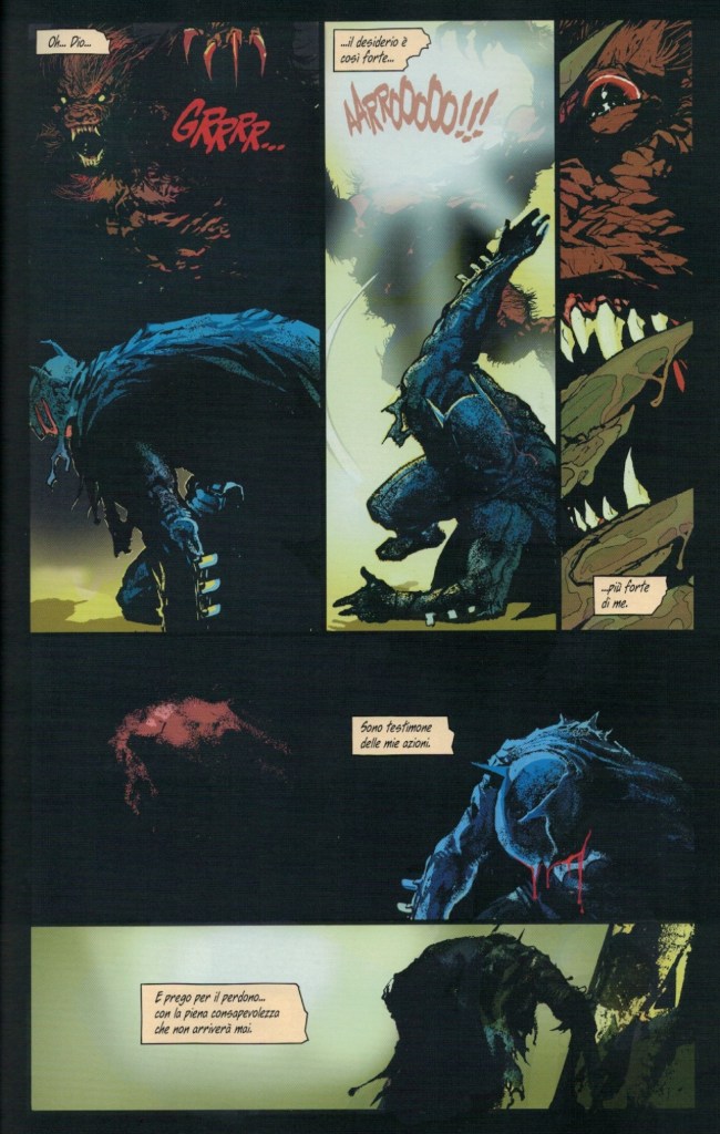 Nelle vicende narrate in Luna piena ci sono infatti almeno 3 personaggi che fanno unicamente presenza, senza interagire davvero con gli eventi. In ordine di importanza, il primo è il commissario Gordon che si limita a sbraitare ai suoi uomini di andare di qua o di là, ma in fondo ci sta: è il suo ruolo prima di una rivalutazione tutto sommato recente. Il secondo più clamorosamente inutile è John Constantine, che di fatto sta nella storia unicamente cercando di ripigliarsi Zatanna che gli è stata soffiata da Bruce Wayne e ammanendo i presenti e i lettori con battute a sfondo sessuale tra lo scontato e l’imbarazzante. Il terzo personaggio inutile è… proprio Batman. Alla fine il suo ruolo è solo quello di farsi contagiare dal morbo della licantropia così da far muovere gli altri alla ricerca di un antidoto – medico o magico – per evitare che un lupo mannaro formato vendicatore oscuro scorrazzi per le strade di Gotham. Parentesi: il curatore dell’edizione italiana, Francesco Tedeschi, ci tiene a specificare nell’introduzione che licantropi e lupi mannari sono esseri diversi, ma poi nel fumetto i due termini sono usati come perfettamente interscambiabili. Certo: è interessante lo sviluppo col confronto tra Zatanna convinta che la cura passi per le arti magiche e Bruce Wayne che ha fiducia solo nella scienza (e per questo coinvolge Kirk Langstrom che, a sua insaputa, è il responsabile della presenza del licantropo a Gotham). Ancor più interessante la vicenda del soldato inglese convinto di essere nel giusto a uccidere gente in guerre lontane da casa che, trasformandosi in lupo mannaro, è costretto a uccidere chi gli sta intorno e che ama. E fondamentalmente Luna piena è proprio la sua storia, la storia del soldato Talbot, che deve essere ucciso proprio perché a furia di essere bravo a fare il soldato si è trasformato in una perfetta macchina di morte. E poi certo, c’è anche Batman.