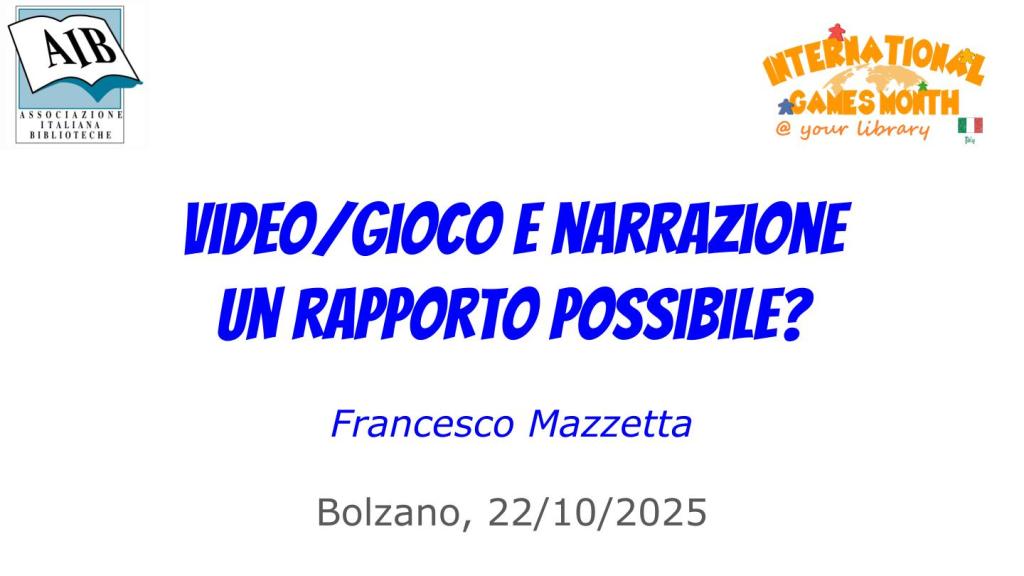 Quando per un intervento alla giornata delle biblioteche del Trentino Alto Adige organizzata a Bolzano lo scorso 22 ottobre dalla sezione regionale dell’Associazione Italiana Biblioteche mi è stato chiesto un intervento sul tema Video/gioco e narrazione: un rapporto possibile? Ho pensato di prendere spunto proprio dal nuovo libro di Bittanti che, tra le altre analisi, alcune senza alcun dubbio geniali, ripropone sul rapporto tra videogioco e narrazione esattamente la stessa posizione di vent’anni fa. Ripropongo qui di seguito pertanto le slide e il percorso argomentativo utilizzato a Bolzano, cogliendo l’occasione per ampliare e spiegare più diffusamente alcuni punti tagliati per rispettare l’economia dell’esposizione.