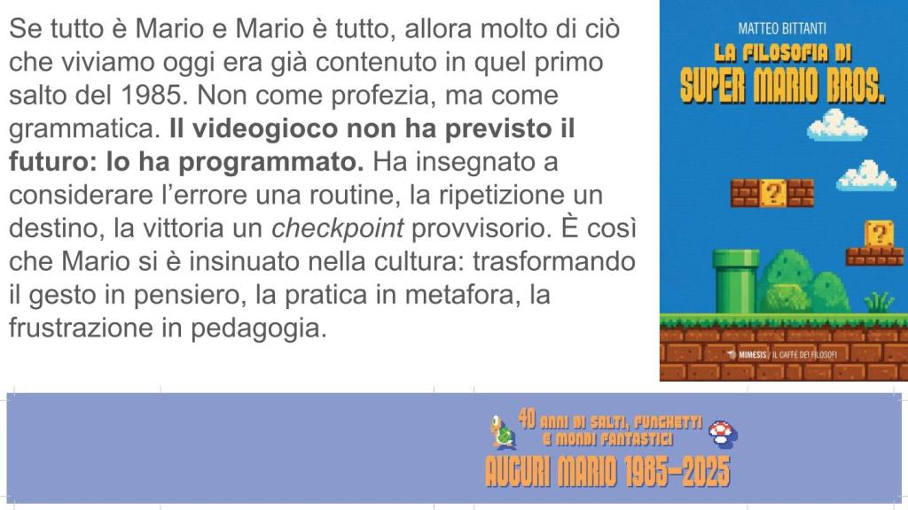 Se tutto è Mario e Mario è tutto, allora molto di ciò che viviamo oggi era già contenuto in quel primo salto del 1985. Non come profezia, ma come grammatica. Il videogioco non ha previsto il futuro: lo ha programmato. Ha insegnato a considerare l’errore una routine, la ripetizione un destino, la vittoria un checkpoint provvisorio. È così che Mario si è insinuato nella cultura: trasformando il gesto in pensiero, la pratica in metafora, la frustrazione in pedagogia. [evidenziazione mia]