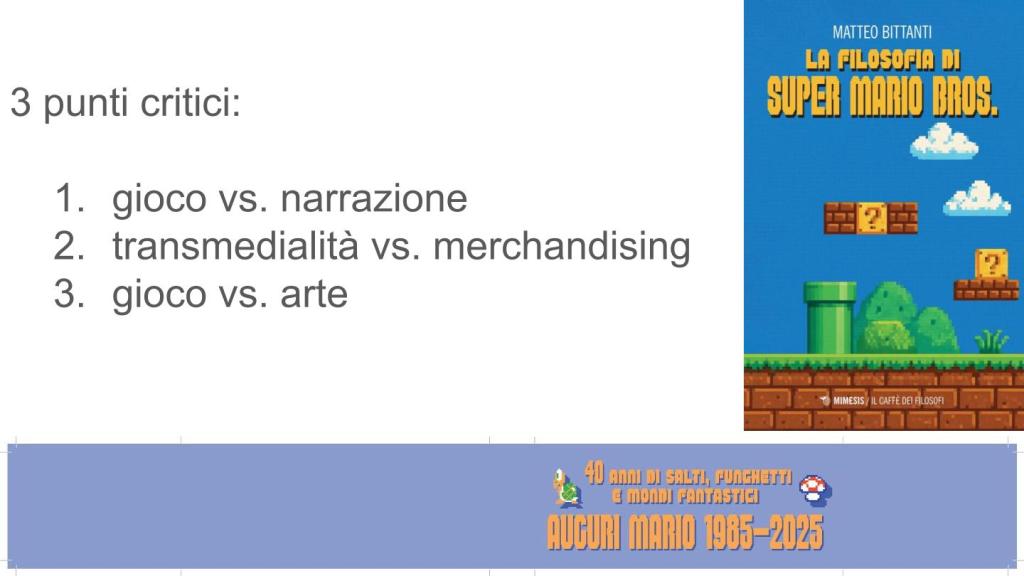 È da poco uscito, per Mimesis, il libro di Matteo Bittanti dedicato a studiare La filosofia di Super Mario Bros. a quarant’anni dalla sua pubblicazione. Per chi non lo conosca, occorre precisare che Matteo Bittanti è uno dei primi e più importanti studiosi italiani di videogiochi. Curatore dal 2002 della storica collana Ludologica di Unicopli, è stato visiting scholar all’Università di Stanford, ricercatore all’Università di Berkeley e attualmente insegna al California College of the Arts di San Francisco e Oakland dove tiene corsi di arte contemporanea, visual culture, media studies e game art all’interno dei programmi di laurea in Visual Studies & Critical Studies, inoltre è coordinatore didattico del Master of Arts in Game Design e tiene l’insegnamento Social Change in the Digital Age nella laurea in Comunicazione d’impresa e relazioni pubbliche e Comunicazione Digitale nella laurea in Comunicazione, Media e Pubblicità presso l’Università IULM. Prima di La filosofia di Super Mario Bros. Bittanti ha curato per Mimesis altri sei raccolte di saggi di critica videoludica. Su Bittanti ho a più riprese scritto e almeno una volta l’ho pure incrociato ad un convegno in cui eravamo entrambi relatori. Ricordo qui la mia recensione alla raccolta Il videogioco in Italia: storie, rappresentazioni, contesti curata da Marco Benoît Carbone e Riccardo Fassone per Mimesis che contiene il suo saggio su Forza Horizon 2; quella relativa al volume da lui curato, sempre per Mimesis, su Fenomenologia di Grand Theft Auto; e infine la recensione alla raccolta (seminale) curata da Bittanti per Costa & Nolan Gli strumenti del videogiocare. Quest’ultima recensione è stata pubblicata su il manifesto (il 28/12/2005) ma si è sviluppata una discussione tra il sottoscritto e Bittanti sugli “equivoci narrativi” dei videogiochi che ho pubblicato sul blog. Sostanzialmente vent’anni fa Bittanti scriveva, a proposito di “equivoci narrativi”: “Il videogioco è tante cose. Ma non è sicuramente un racconto.”