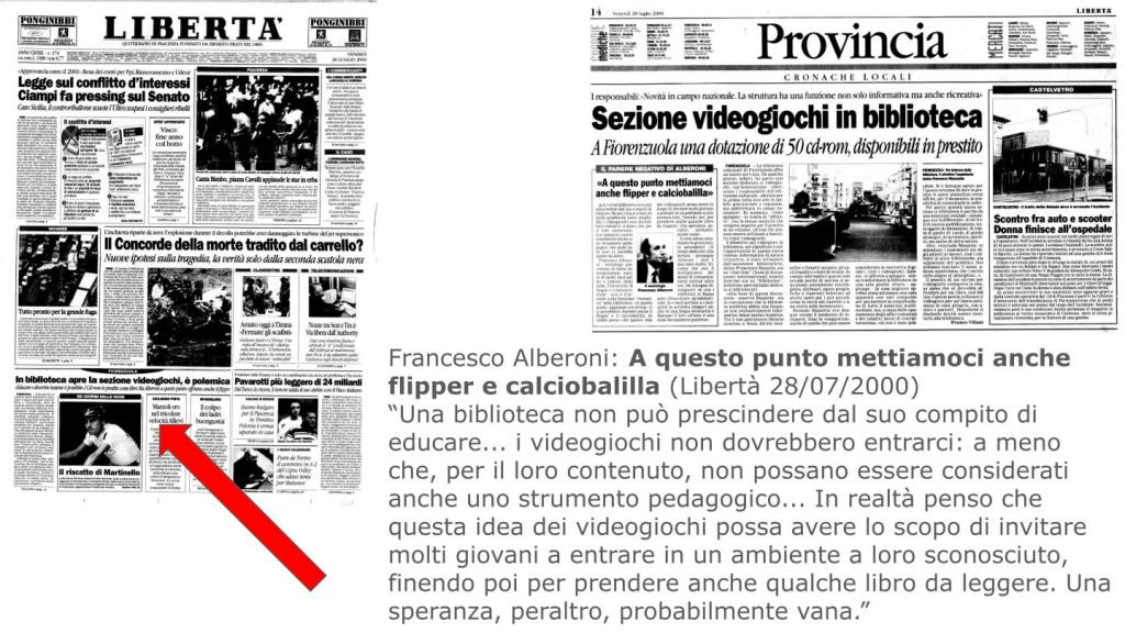 Questa giudizio mi ha riportato a venticinque anni fa quando, pioniere nell’introdurre i videogiochi nelle collezioni della biblioteca (due resoconti possono essere letti su Bibliotime del 11/1998 e 03/2001), mi ritrovai in prima pagina su Libertà (il quotidiano della provincia di Piacenza) con tanto di dotto parere del sociologo Francesco Alberoni sull’iniziativa.