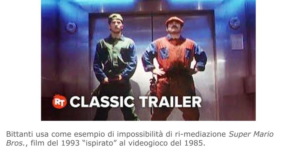 In particolare Bittanti critica il concetto di transmedialità così come proposto da Henry Jenkins nei testi Cultura convergente (Apogeo, 2007) e Fan, blogger e videogamers: l’emergere delle culture partecipative nell’era digitale (Franco Angeli, 2008): secondo lui non siamo in presenza di una “ri-mediazione” ma piuttosto di un fenomeno di “merchandising”. Per “ri-mediazione” si intende il concetto introdotto da Jay David Bolter e Richard Grusin in Remediation. Competizione e integrazione tra media vecchi e nuovi (Guerini, 2005) che descrive il processo di adattamento da un medium all’altro di un’opera culturale. Per Bittanti questo processo è impossibile da un medium interattivo come il videogioco ad altri media non interattivi come film, romanzi, fumetti, ecc. E quindi semplicemente il concetto di transmedialità non ha senso. E Bittanti ha – apparentemente – gioco facile a dimostrarlo mostrando il tentativo di trasposizione cinematografica di Super Mario Bros.: il film omonimo del 1993 diretto da Rocky Morton e Annabel Jankel con protagonisti di un certo livello come Bob Hoskins e Dennis Hopper (nella slide il trailer). Lo stesso Hoskins, ha proposito del film, ha dichiarato che si tratta del peggior film in cui abbia recitato. Del resto la storia vede le tartarughe koopa trasformate in dinosauri che vogliono conquistare la terra attraverso elezioni truccate e tutto si svolge in una demenziale versione alternativa del nostro universo senza praticamente alcuna attinenza non si dice con la storia, ma neppure con l’ambientazione originale.