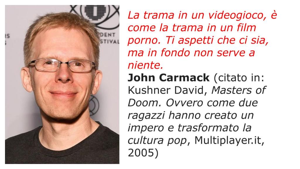 John Carmack è uno dei creatori di uno dei più noti e fortunati generi videoludici, quello degli sparatutto in prima persona (First Person Shooter o FPS), genere che ha il suo capostipite in DOOM. E Carmack ha testualmente affermato che “La trama in un videogioco, è come la trama in un film porno. Ti aspetti che ci sia, ma in fondo non serve a niente” (riportato in Masters of Doom. Ovvero come due ragazzi hanno creato un impero e trasformato la cultura pop di David Kushner, Multiplayer.it, 2005).