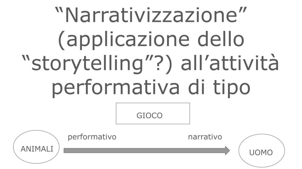 Ecco allora che possiamo tracciare una sorta di linea evolutiva dal gioco animale a quello umano, all’interno della quale viene ad incidere lo storytelling, cioè l’uso di elementi narrativi. Sicuramente aggiuntivi e, da un punto di vista mediale, non necessari, ma non inessenziali nelle specifiche opere in cui sono utilizzati.