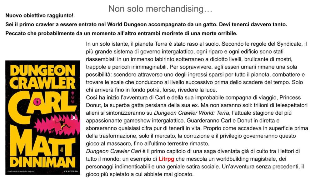 Anche di Dungeon Crawler Carl ho scritto diffusamente sul blog quindi non mi dilungo oltre se non per ribadire come il meccanismo del “dungeon crawler”caratteristico di giochi e videogiochi di ruolo viene intelligentemente utilizzato da Dinniman per appassionare il lettore.
