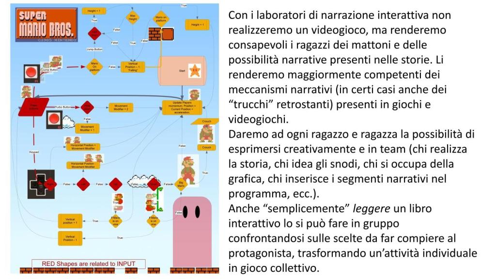 Dal punto di vista bibliotecario e scolastico con i laboratori di narrazione interattiva non realizzeremo un videogioco (cosa per cui occorrerebbero competenze informatiche e attrezzature tecniche), ma renderemo consapevoli i ragazzi dei mattoni e delle possibilità narrative presenti nelle storie. Li renderemo maggiormente competenti dei meccanismi narrativi (in certi casi anche dei “trucchi” retrostanti) presenti in giochi e videogiochi. Daremo ad ogni ragazzo e ragazza la possibilità di esprimersi creativamente e in team (chi realizza la storia, chi idea gli snodi, chi si occupa della grafica, chi inserisce i segmenti narrativi nel programma, ecc.). Anche “semplicemente” leggere un libro interattivo lo si può fare in gruppo confrontandosi sulle scelte da far compiere al protagonista, trasformando un’attività individuale in gioco collettivo.