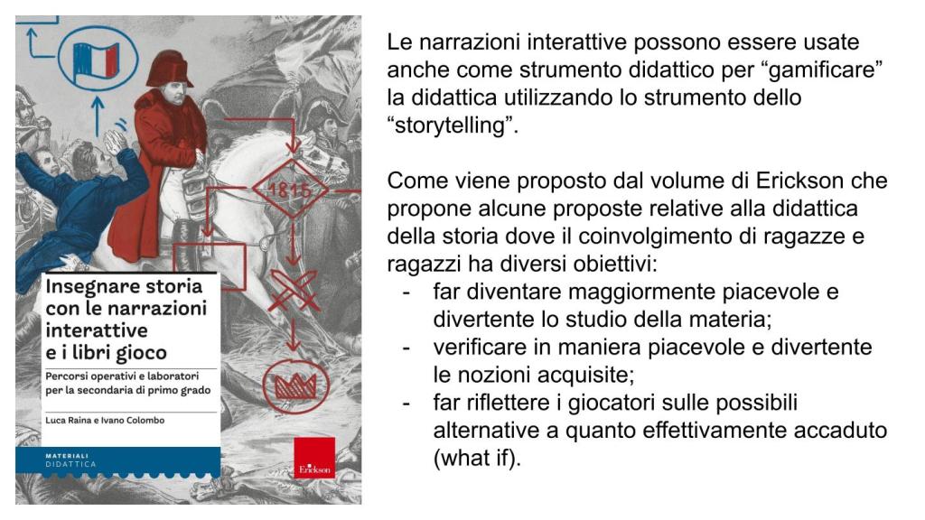Le narrazioni interattive possono essere usate anche come strumento didattico per “gamificare” la didattica utilizzando lo strumento dello “storytelling”. Come, ad esempio, viene proposto dal volume di Erickson Insegnare storia con le narrazioni interattive e i libri gioco. Percorsi operativi e laboratori per la secondaria di primo grado di Luca Raina e Ivano Colombo che propone alcune proposte relative alla didattica della storia dove il coinvolgimento di ragazze e ragazzi ha diversi obiettivi: