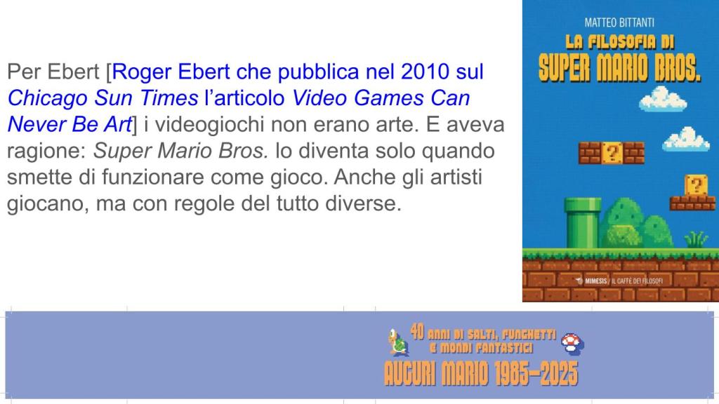 Per Ebert i videogiochi non erano arte. E aveva ragione: Super Mario Bros. lo diventa solo quando smette di funzionare come gioco. Anche gli artisti giocano, ma con regole del tutto diverse. (p. 242)