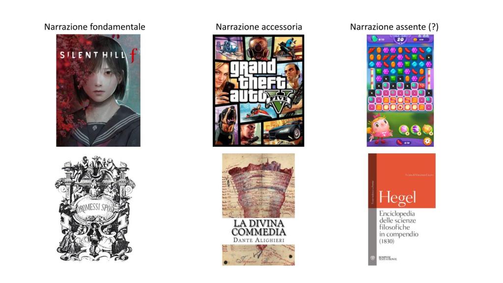 Si tratta di una slide (di volta in volta aggiornata) che ho utilizzato per parlare della presenza dell’elemento narrativo nei videogiochi fin dalla prima presentazione del mio libro del 2013. La finalità era quella di mostrare agli scettici (che obiettavano – su scorta bittantiana? – l’assenza di storie come critica all’ingresso dei videogiochi in biblioteca) che ci sono videogiochi in cui le storie sono in effetti assenti (come in Candy Crush), altri in cui le storie sono presenti ma non sono essenziali, potendosi fruire il gioco senza minimamente preoccuparsi della storia o delle storie sottostanti (come in Grand Theft Auto) ma, infine, ci sono anche giochi a cui, se sottraiamo l’elemento narrativo, non sono più fruibili (come nell’appena uscito Silent Hill f, ma consiglio, per un approfondimento, la lettura di Keiichirō. La vera storia del team di reietti che ha inventato Silent Hill di Fabio Di Felice che ho presentato qui). Ovviamente la stessa ituazione è presente nei documenti maggiormente presenti in una biblioteca: i libri.