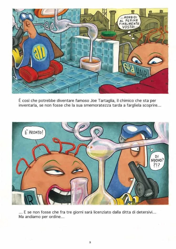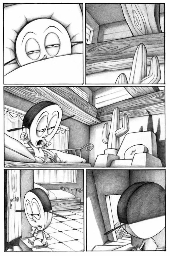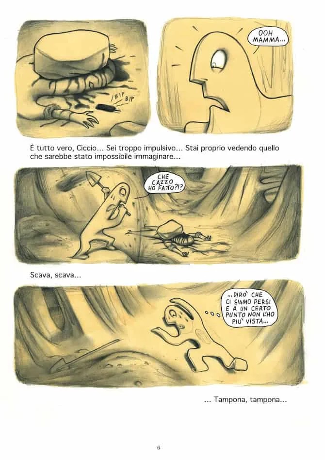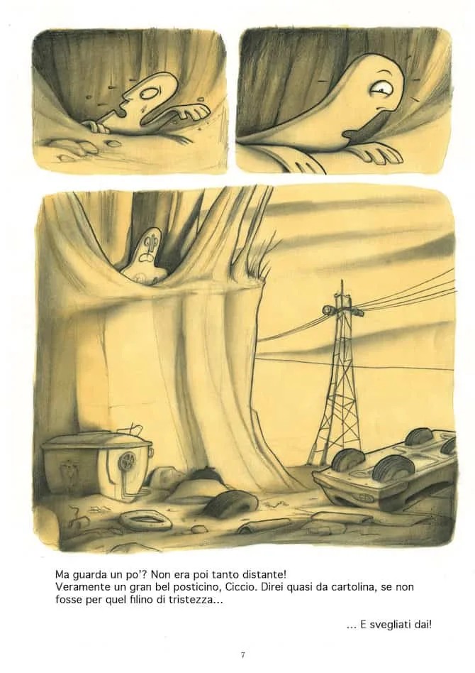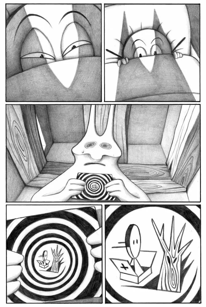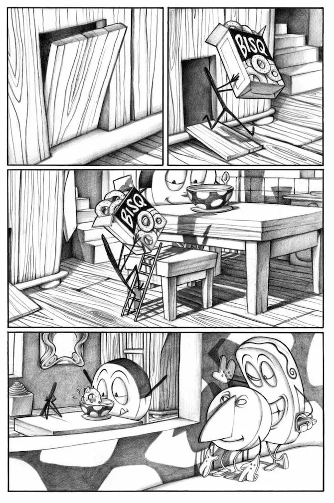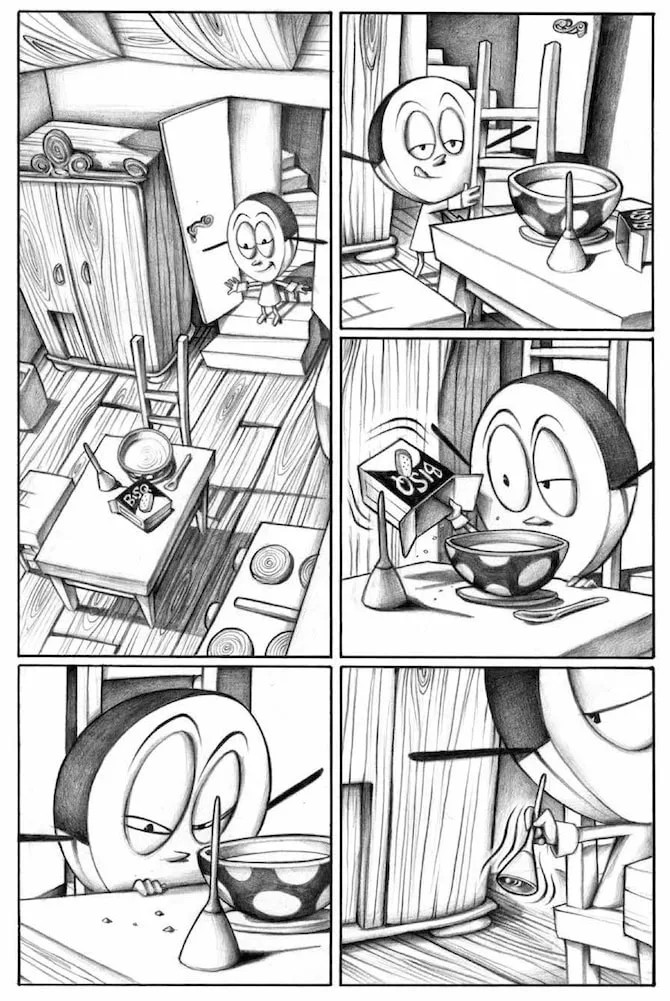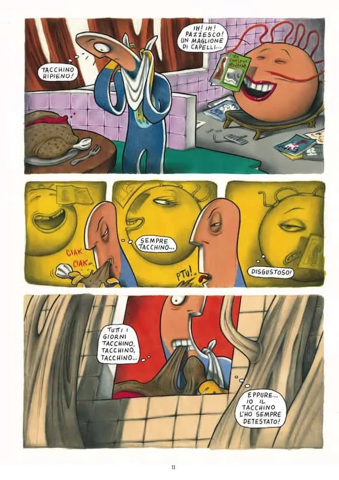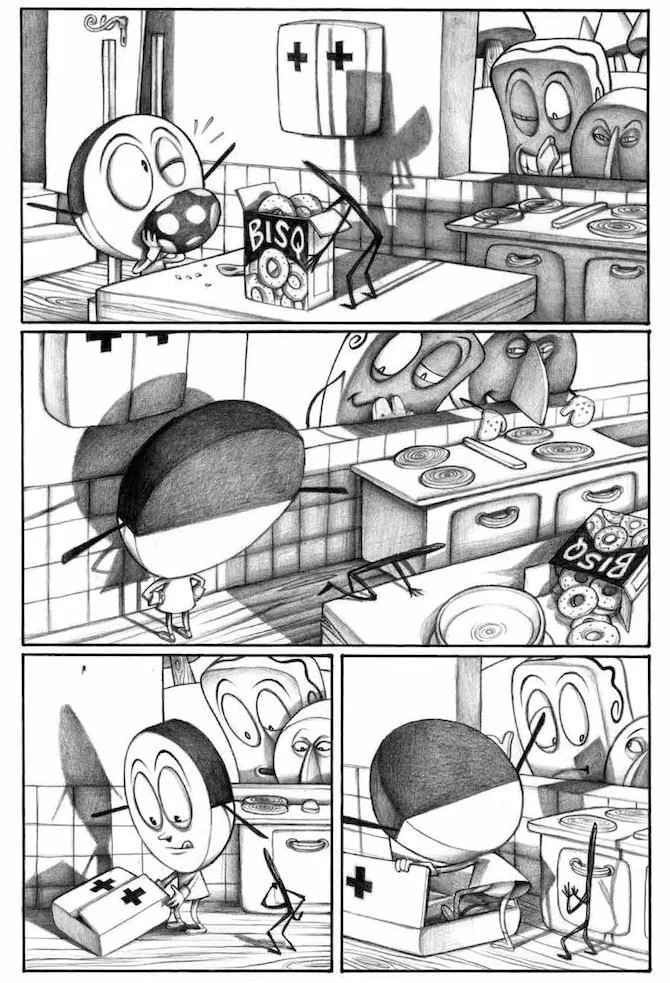 Se Bang! Sei morto è una lettura piacevole e intrigante, la raccolta di storie dedicate a Pastil dimostra (se ancora ce ne fosse bisogno) il genio di Francesca. Per cominciare si tratta di un silent graphic novel. Avevo già scritto di questa tipologia di fumetti a proposito di Step by bloody step Simon Spurrier e Matias Bergara con i colori di Matheus Lopes (Editoriale Cosmo, 2023) per mostrare come il medium fumetto fosse ben lontano dall’essere “accessibile” come sentenziato da studiosi poco attenti. Se in Step by bloody step viene usata una lingua che nessun lettore può conoscere, in Pastil è bandito qualsiasi suono. Pastil è l’equivalente di un film muto senza didascalie. E il vorticoso bianco e nero rende ancora più drammatiche le dis-avventure della piccola pastiglia protagonista che si ritrova immersa in un mondo onirico, meraviglioso e pauroso allo stesso tempo. E se le prime due storie sono, in qualche modo, circolari, nella terza Francesca rifiuta di chiudere il cerchio e fa volare via la nostra protagonista, chissà verso quali nuove avventure. Si tratta apparentemente di storie “piccole” – trovare i biscotti e curare il personaggio che li sponsorizza, prendere correttamente una medicina e fuggire di casa temendo di essere punita per un vaso rotto – che diventano enormi e paurose se rapportate alla piccolezza di Pastil e di noi lettori che la seguiamo.