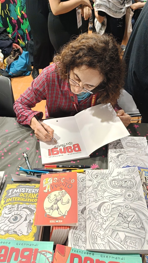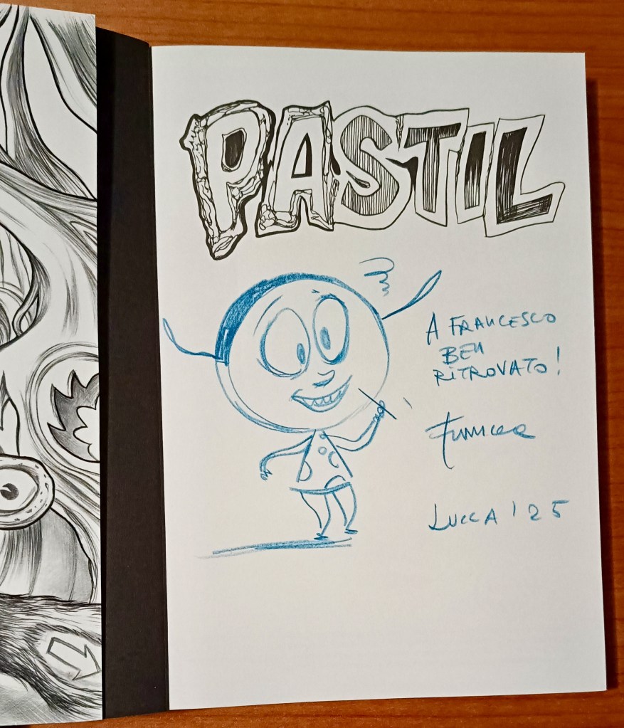 Quest’anno ho colto l’occasione del pellegrinaggio a Lucca Comics & Games per intercettare Francesca allo stand Eris e per farmi autografare Pastil. Tutte le Avventure e Bang! Sei morto. Il primo è stato pubblicato un anno fa e comprende le tre storie dedicate a Pastil: le prime due uscite originariamente nel 1998 e 1999 per la Phoenix di Daniele Brolli e la terza per Einaudi nel 2001 con la protagonista ribattezzata Pasticca. Il secondo invece è l’edizione inedita in Italia – e pubblicata un mese fa – già uscito da oltre vent’anni in Francia, Spagna e Stati Uniti. Il tutto mentre Francesca sta lavorando al suo nuovo libro, sempre per Eris.