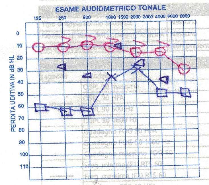 Per chi fosse curiosa/o, lascio qui la scansione di miei due esami audiometrici: il primo risale al gennaio 2022 ed il secondo ai giorni scorsi. La linea blu/nera è quella del canale uditivo di sinistra e la rossa di destra.