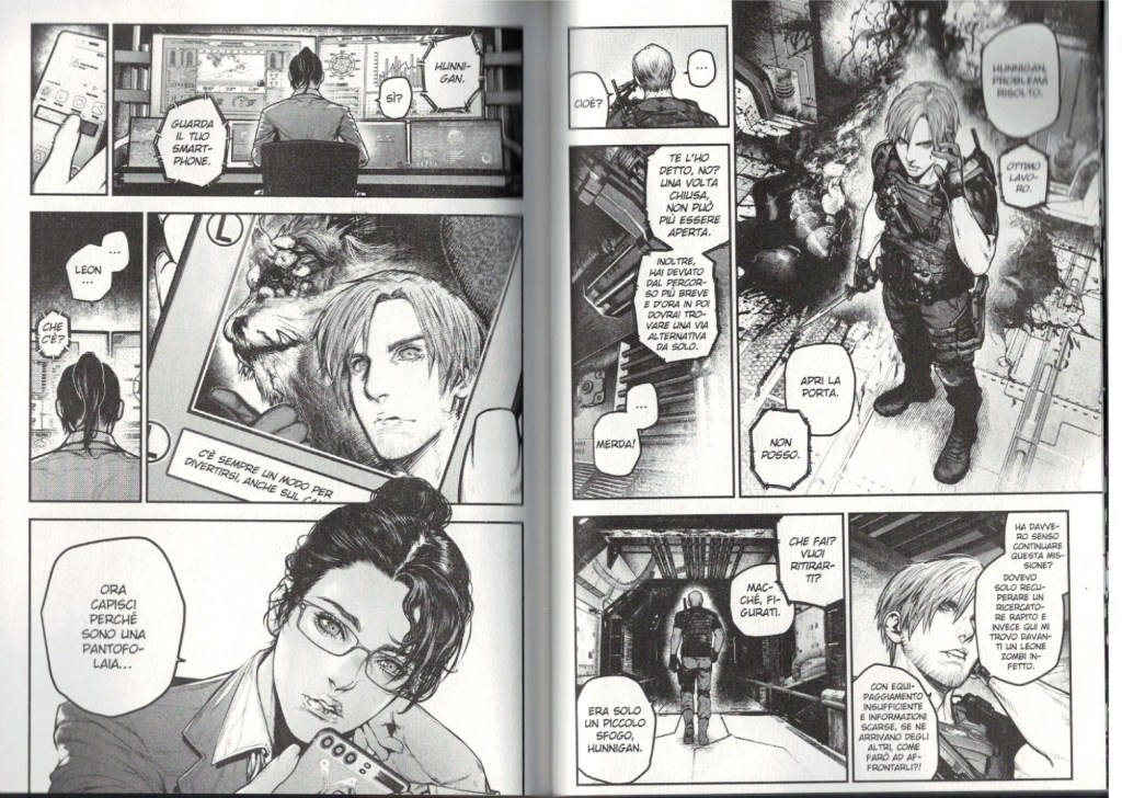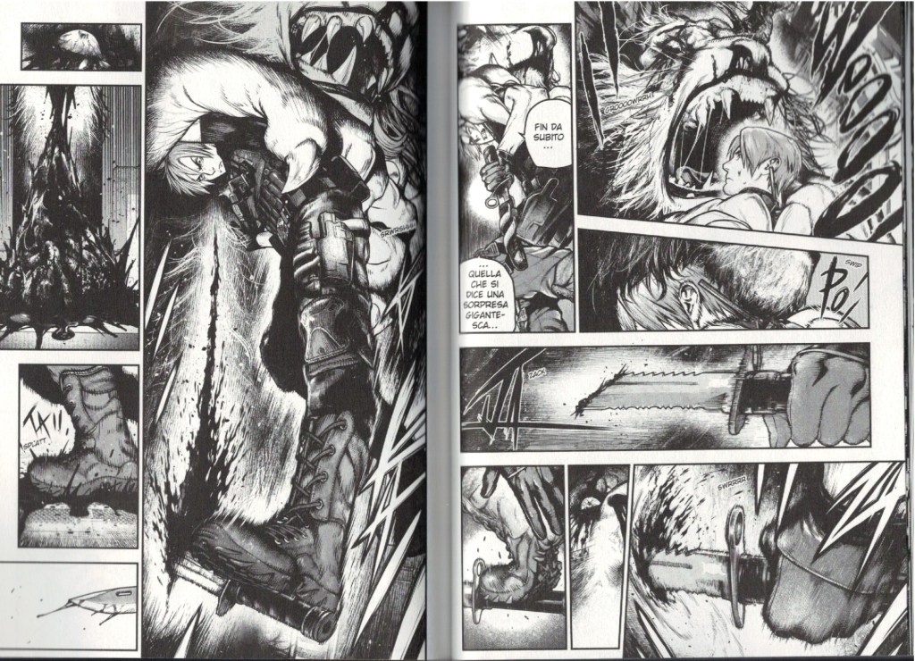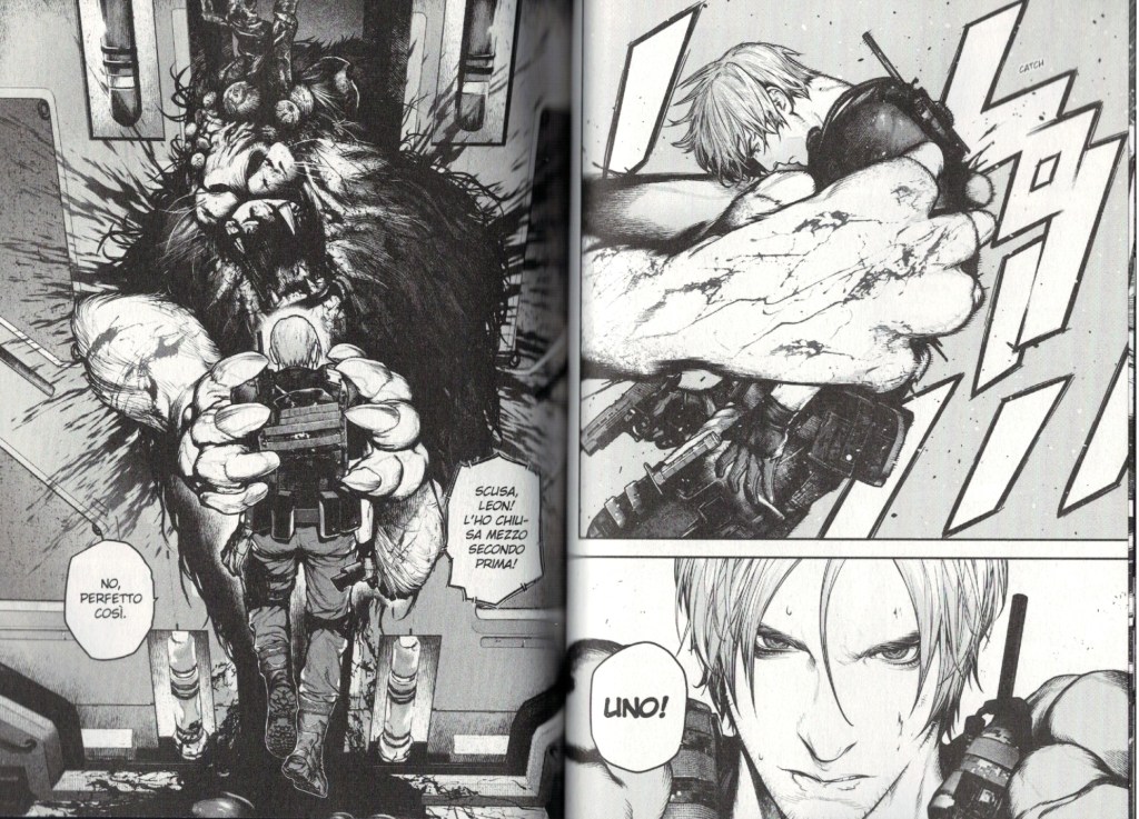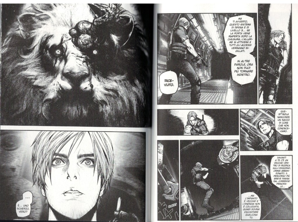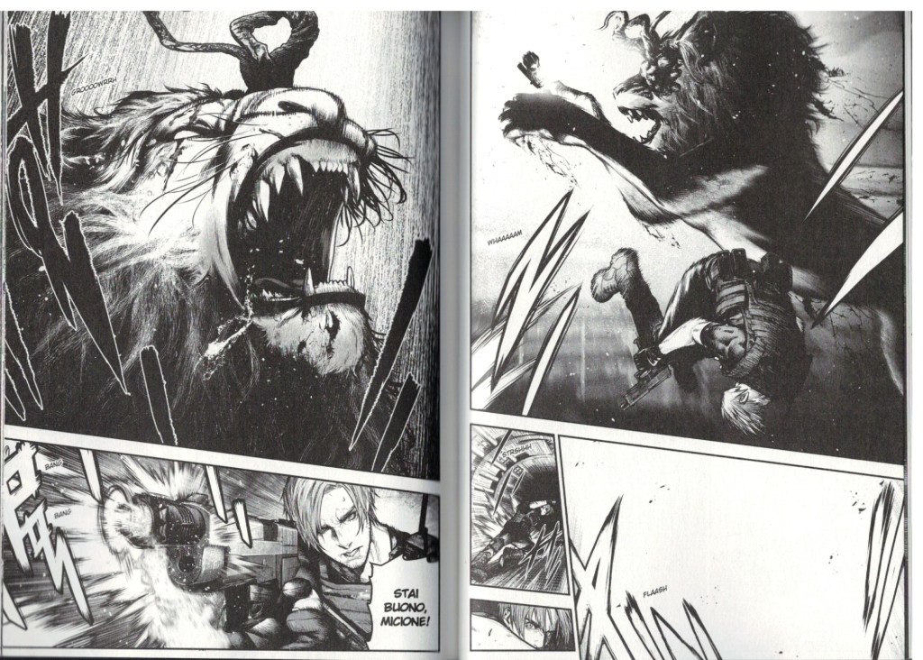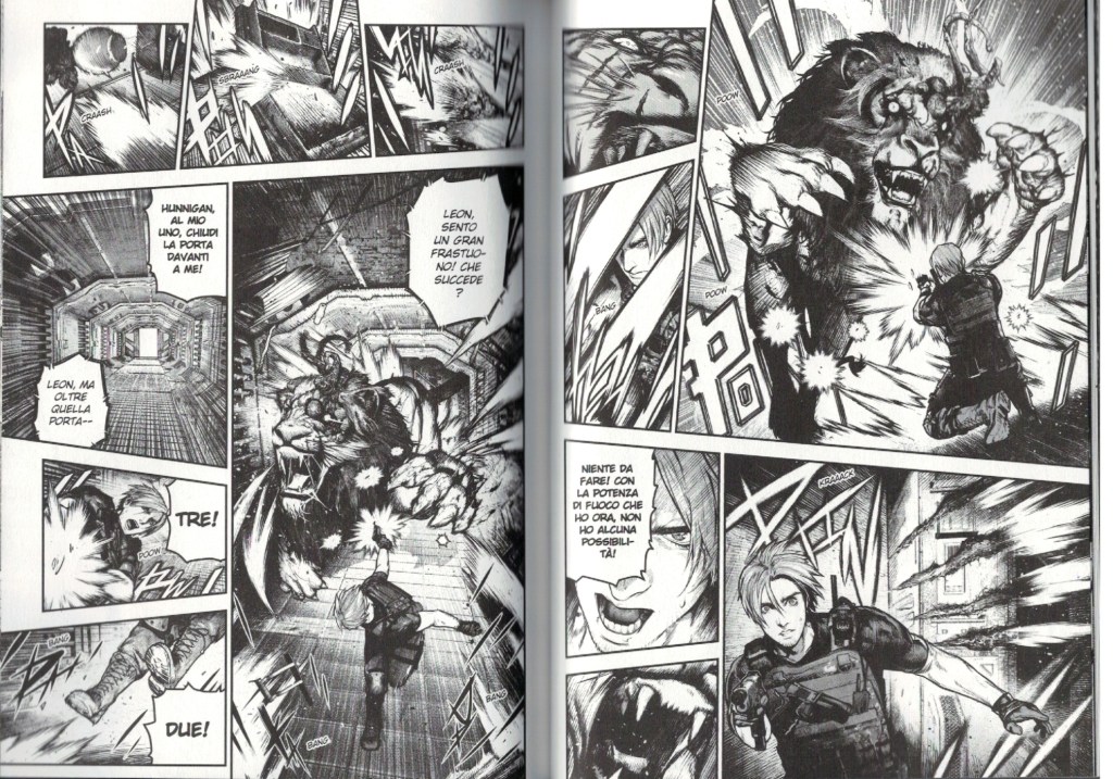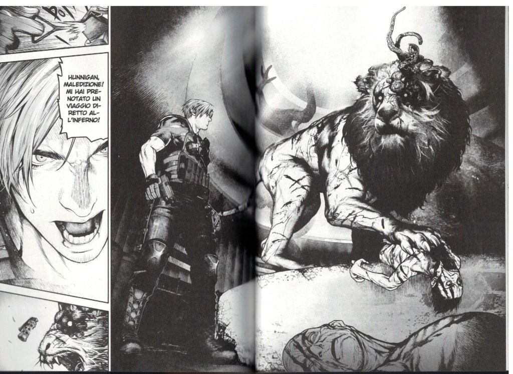 Riporto qui di seguito alcune tavole scansionate dal fumetto (oltre alla copertina e al retro) che non sono quelle iniziali ma piuttosto sono quelle del primo scontro di Leon Kennedy con uno dei mostri (un leone-zombie) creato dal villain della storia: Dylan Blake (a proposito, quasi del tutto tagliata è la backstory che ci spiega perché sia diventato cattivo: che sarebbe un problema solo se a leggere il fumetto fosse qualcuno del tutto digiuno dell’universo residentevoliano).