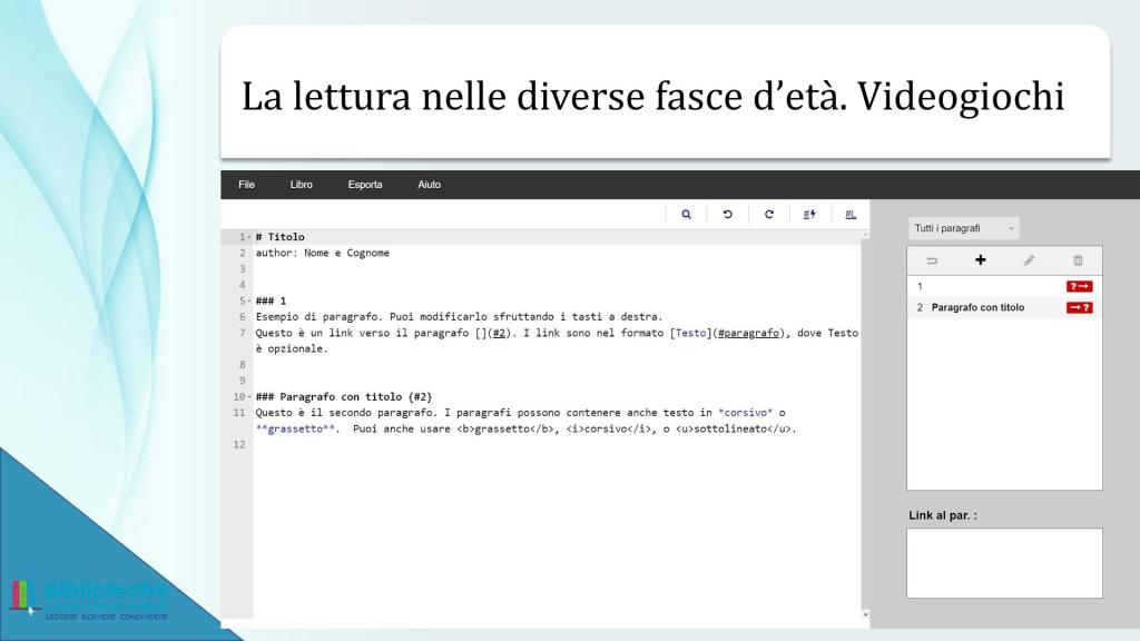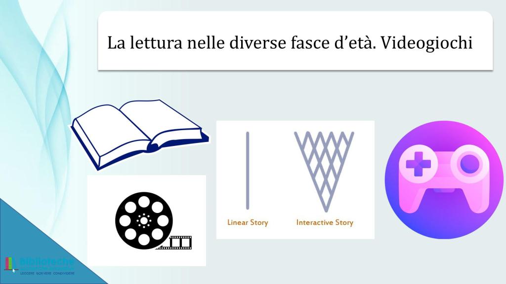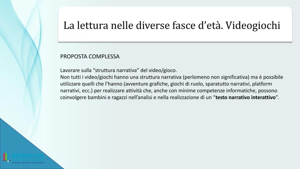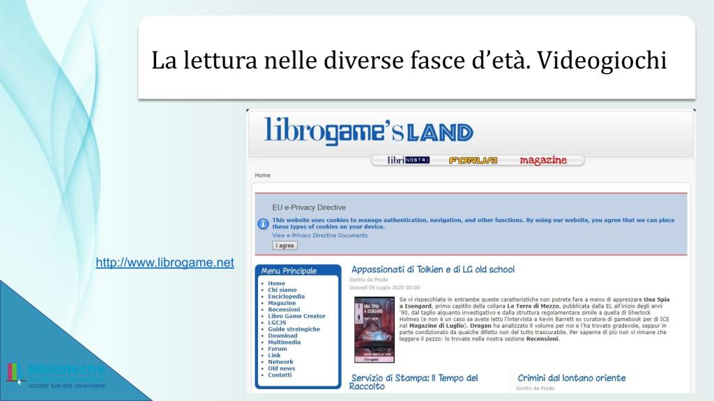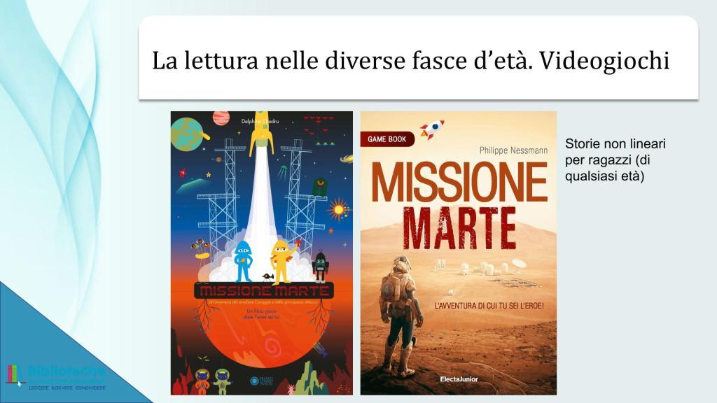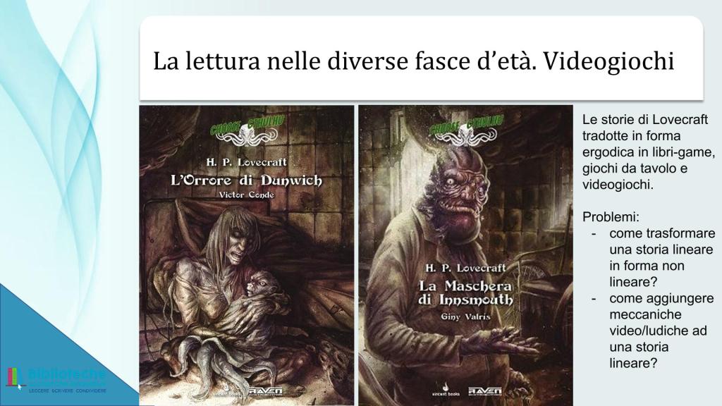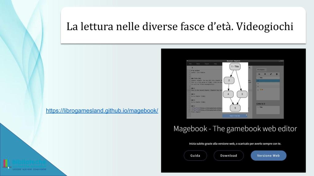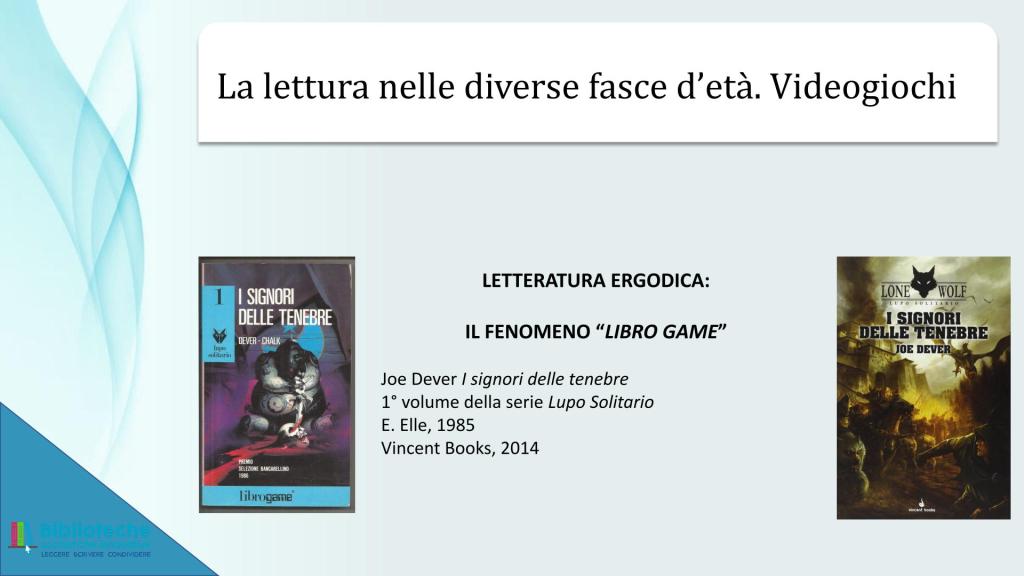 Sostanzialmente mi ha rincuorato il fatto che quello di Angiolino, seppur con assai maggiore risonanza e risultati, è stato lo stesso percorso mio nel proporre a ragazze/i e a insegnanti l’uso dei libri-gioco all’interno dello spazio didattico. Mi sia permesso il peccato di vanità di riportare qui di seguito le slide presentate all’interno di un breve modulo formativo per docenti organizzato dal Ministero dell’Istruzione (allora non ancora “e del Merito”) nel 2022.