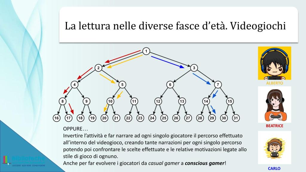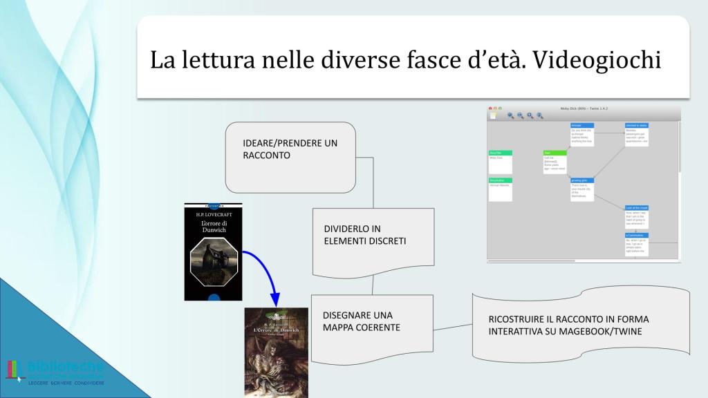 Non commento le slide che mi paiono tutto sommato autoesplicative aggiungendo solo che per me è stato un vero piacere due anni prima, poco prima del lockdown, lavorare con un gruppo di ragazze e ragazzi del Liceo Gioia di Piacenza ad un progetto proprio sulla narrativa interattiva, utilizzando i principi esplicitati anche nel successivo intervento formativo per docenti e riprese e spiegate assai meglio nel libro di Angiolino. Ragazzi e ragazze, dopo un primo incontro “teorico” ed “esemplificativo” avevano lavorato una settimana realizzando in gruppi storie proprie sia in formato elettronico utilizzando lo strumento open source Twine sia in formato analogico realizzando artigianali libretti. In particolare ragazzi e ragazze erano riusciti a coordinarsi esaltando le competenze e le peculiarità di ciascuna/o nel gruppo: chi ideava le storie, chi realizzava lo sviluppo interattivo, chi creava la grafica e le illustrazioni, chi convertiva il materiale in formato elettronico. Dimostrando che tale attività è di estremo valore da un punto di vista didattico ancor prima per la capacità di attivare le capacità relazionali per arrivare ad un obiettivo comune che per le competenze pure effettivamente apprendibili.